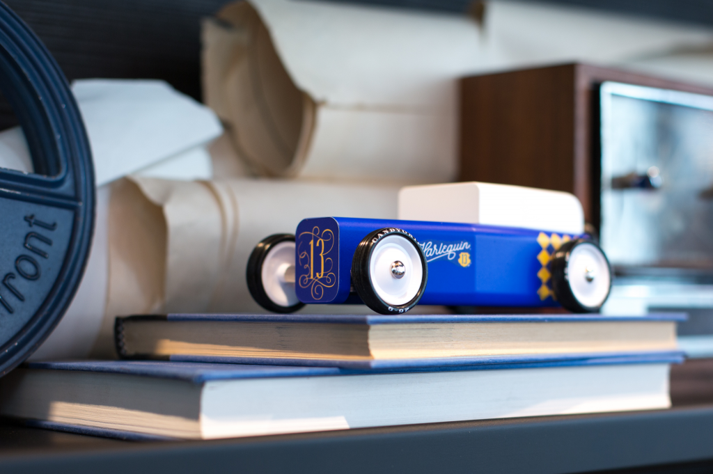 The slickest, lowest riding racer. Stanced, bright blue, and decorated with a Carnival-inspired pattern, sporting a superstition-defying race no. 13, this is Candylab’s flashiest car, with stories to tell.