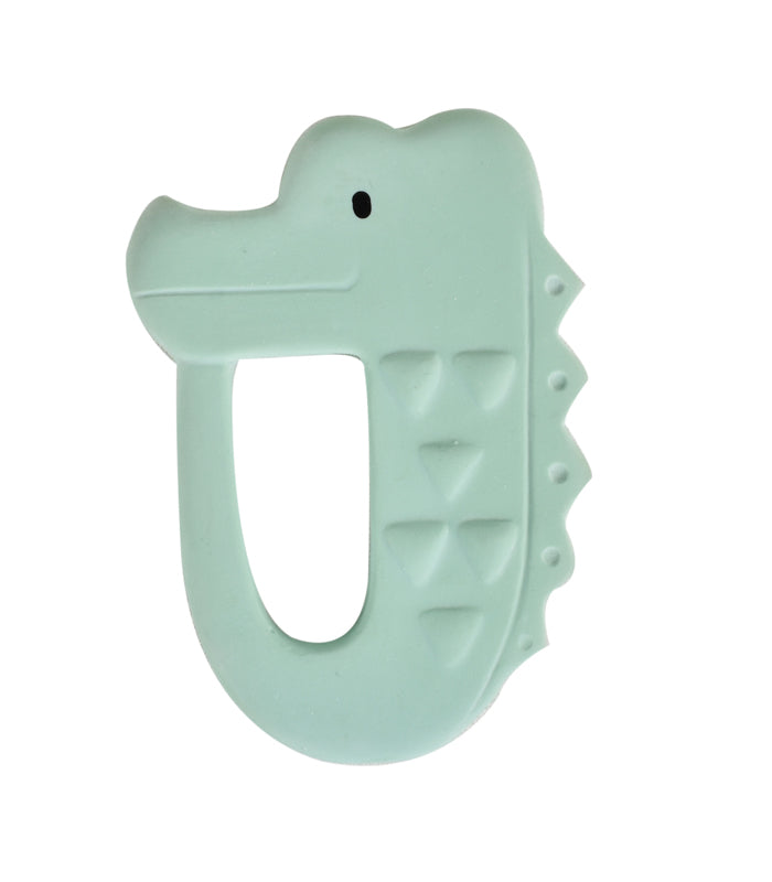 An adorable all rubber crocodile flat teether that is great for little hands to grab. Ridges provide comfort for teething babies. Made from sustainable natural rubber. 100% fragrance-free.