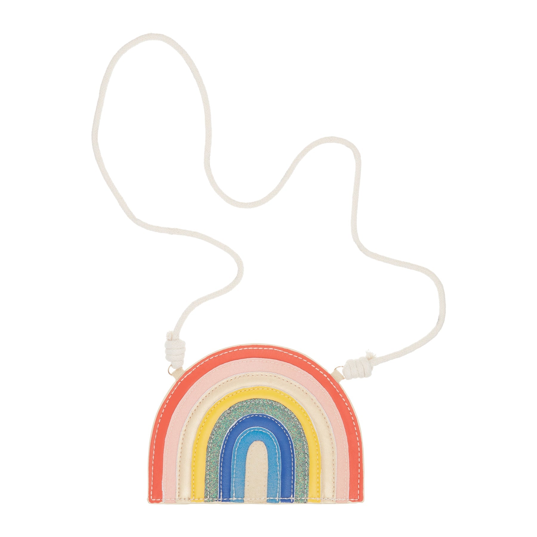 Brighten up their day with this colorful rainbow cross-body bag. Made up of 8 colored sections in a fun, retro palette, this little cross-body bag has a zip top section and a neutral rope strap.