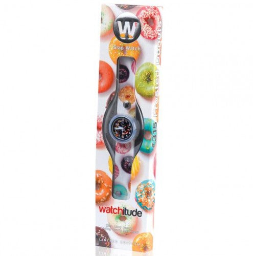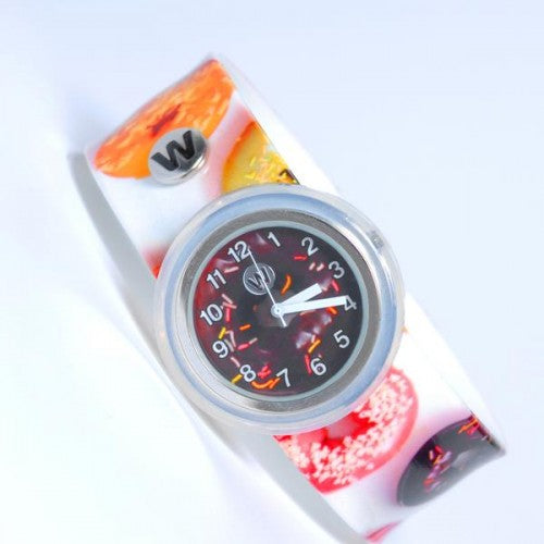 The Frosted Donuts Slap Watch shows delicious and colorful sweet doughnuts lined up and ready to eat