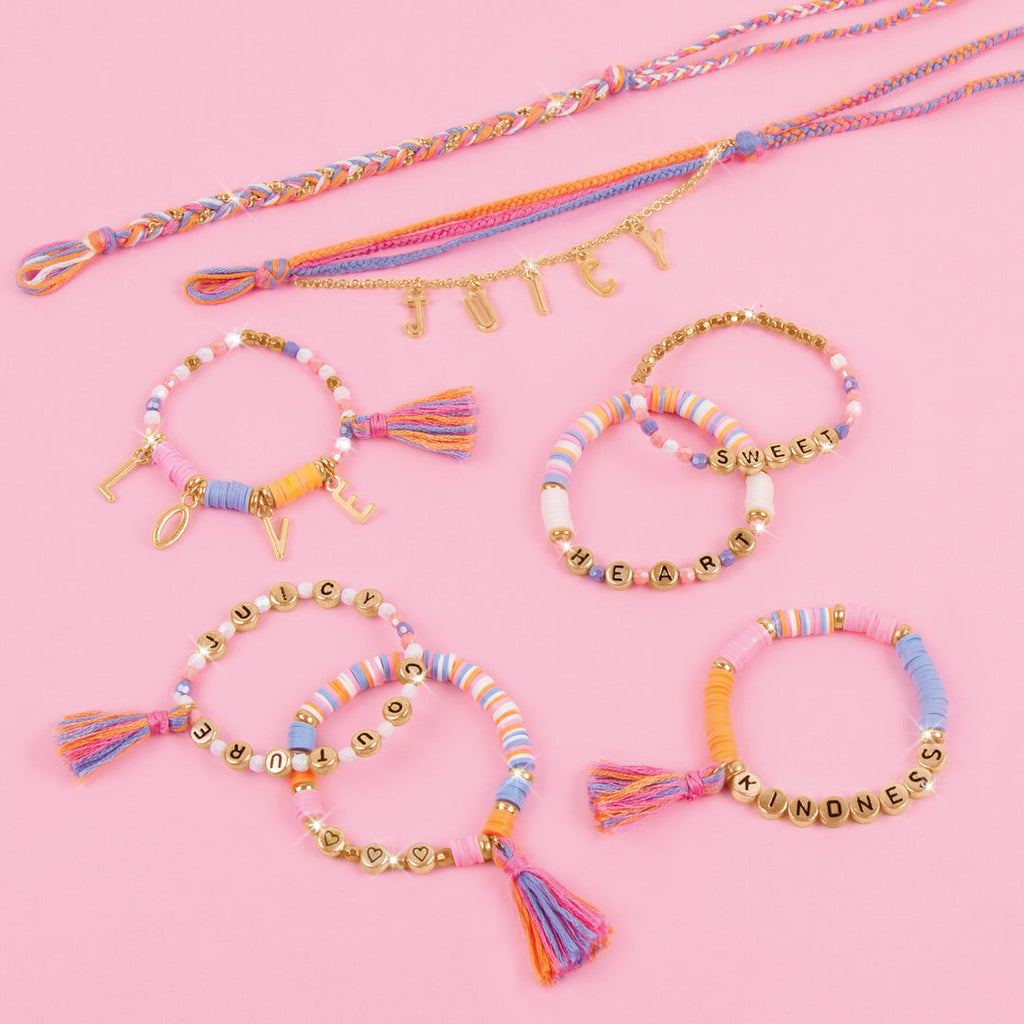 Customize bracelets for your crew! This kit has everything you need to craft your very own Juicy Couture jewellery. Create seriously stunning pieces using a mixture of heishi beads, letter beads, charms, thread and elastic cord. They’ll be so pretty, everyone will think they came from a high-end boutique!