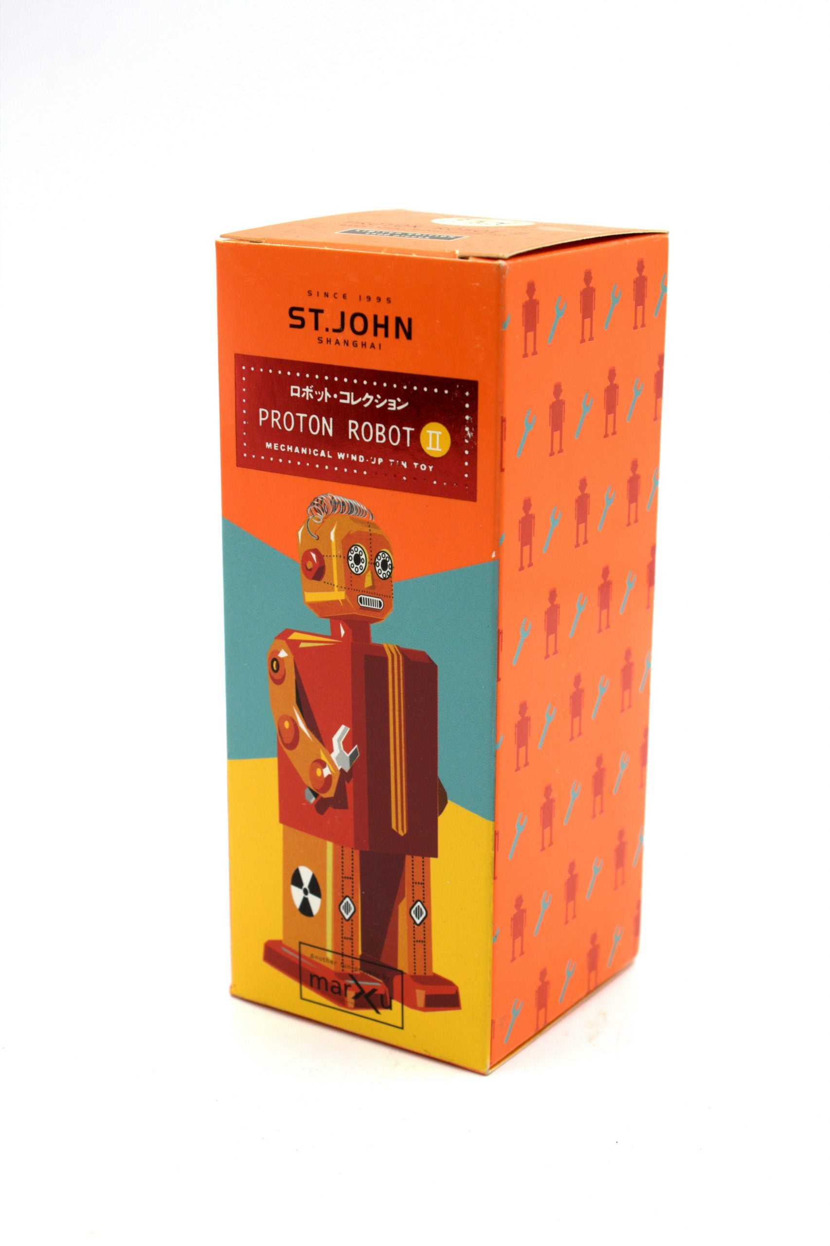 Special edition Golden Proton Robot Tin Toy Windup. Striking gold and orange colours with primitive 1950’s style square head and spring across his head.