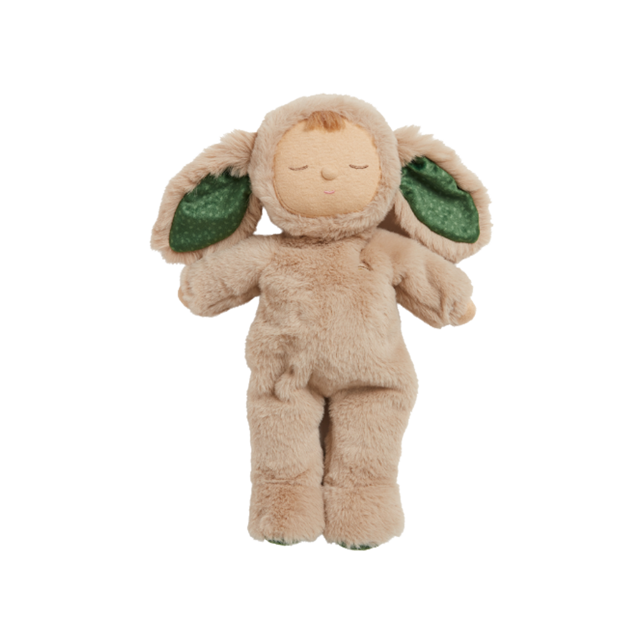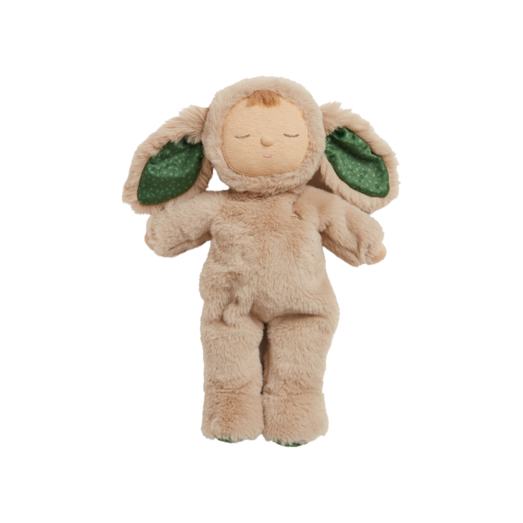 - Cozy Dinkum Dolls wear a non-removable recycled plush onesie with lined ears and embroidered rainbow over the heart.