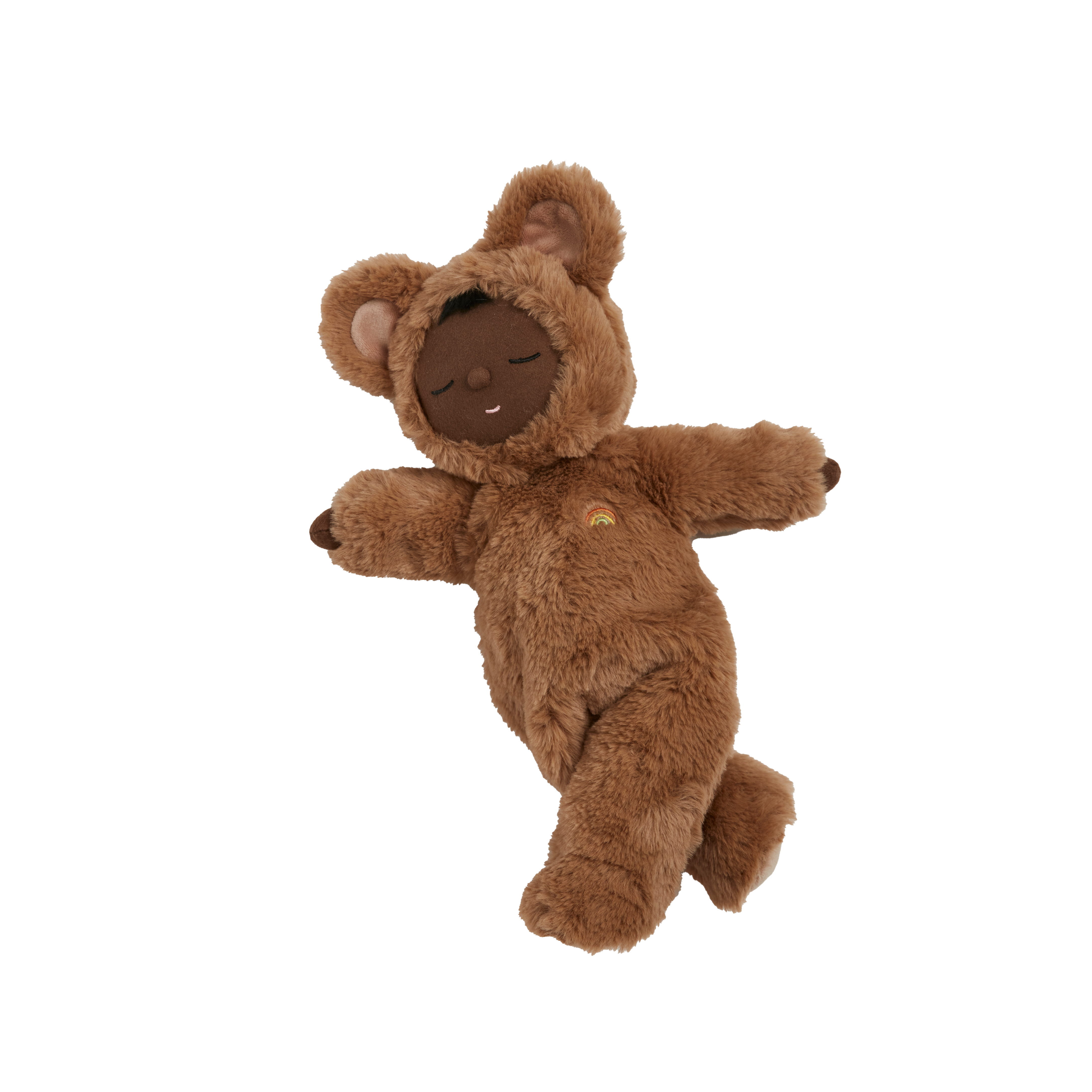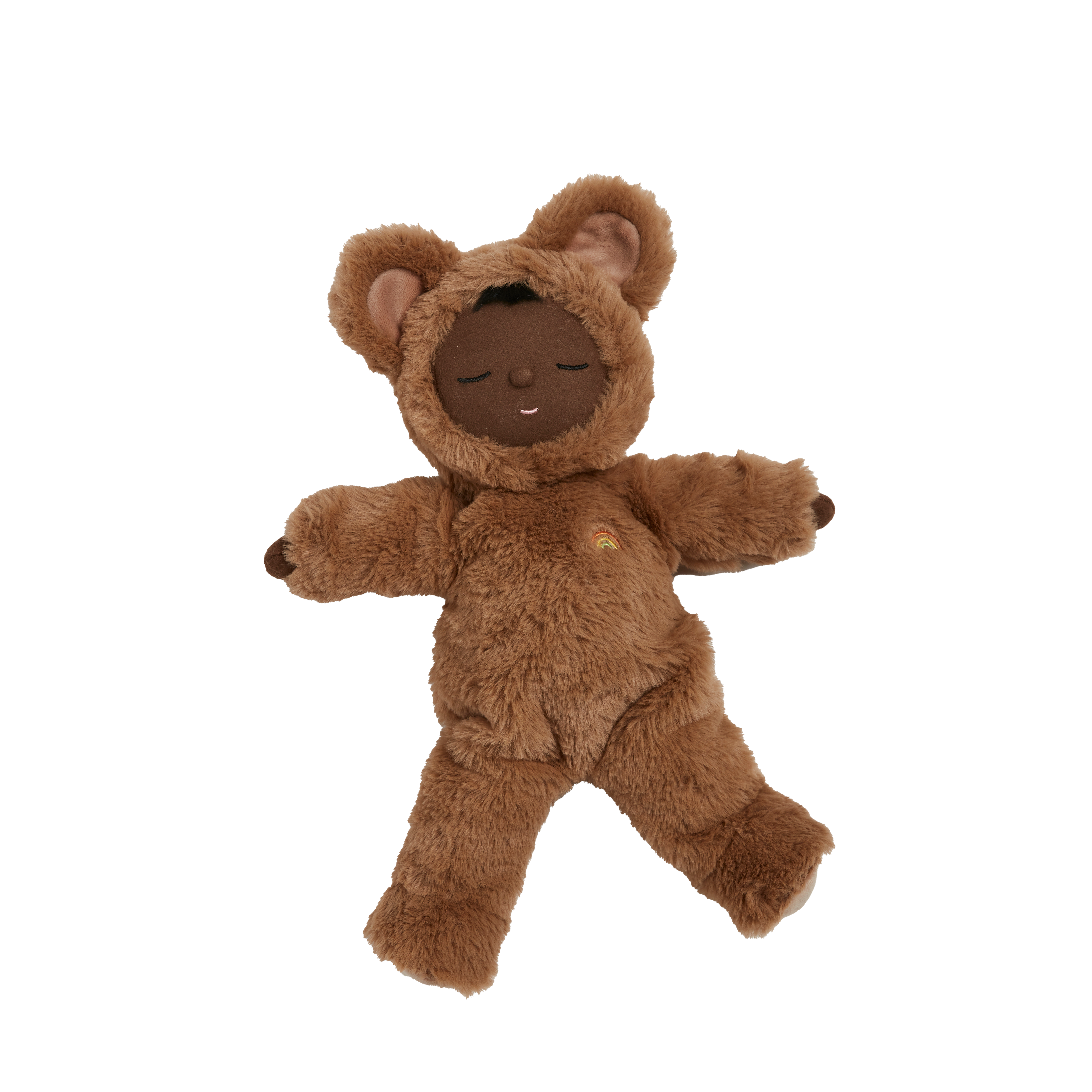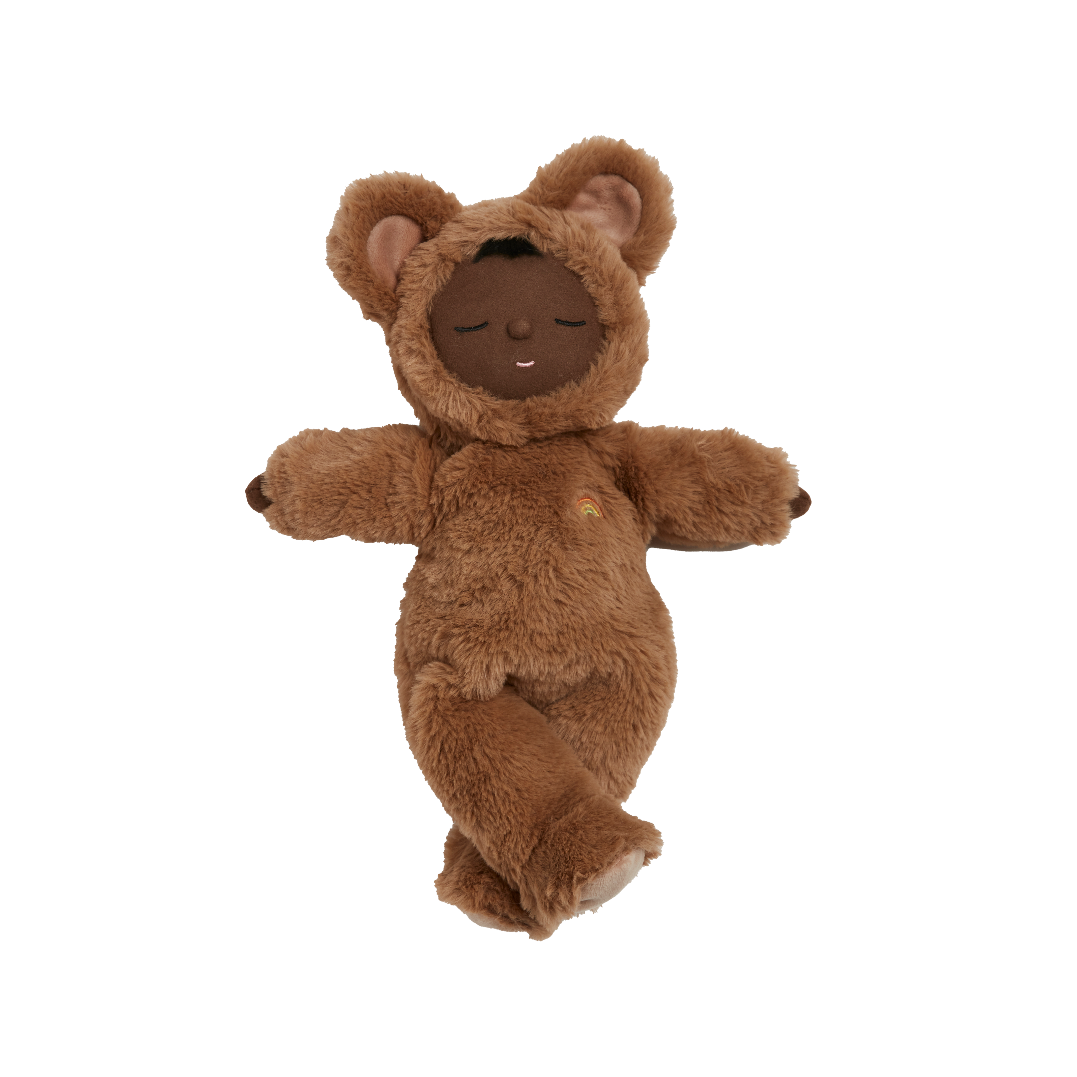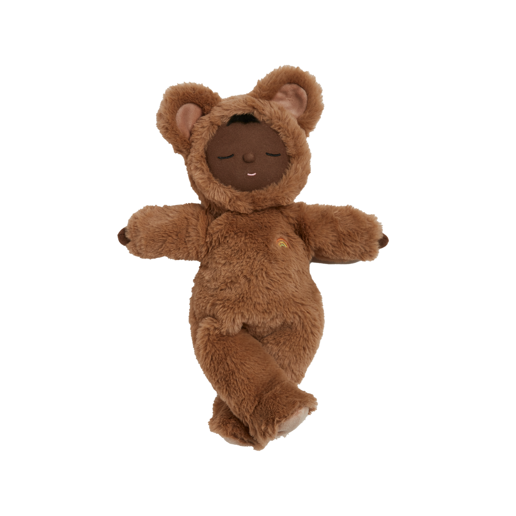 Teddy Mini is posable, made from the plushest outer and features the sweetest embroidered face with a little tuft of hair. Each Cozy Dinkum wears a non-removable suit with two soft furry ears and a rainbow right over their heart.