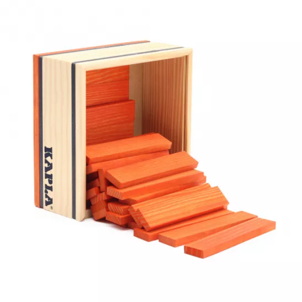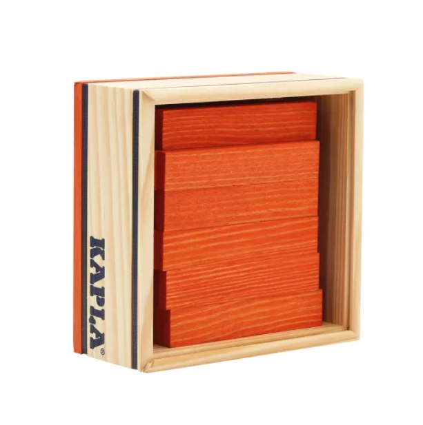 Each KAPLA 40-piece Square contains 40 planks of the same colour. The planks are presented in a neat wooden case decorated with a colour-matched border and closed with a sliding lid.