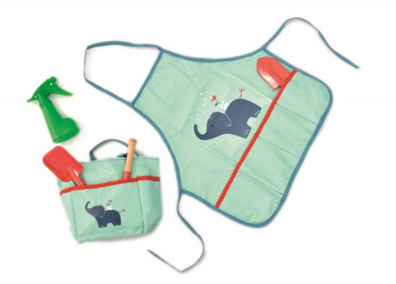 Complete gardening set for the professional little gardener. Including an apron, 2 spades, rake, spray and all this in a nice carry bag with a lovely Elephant print.