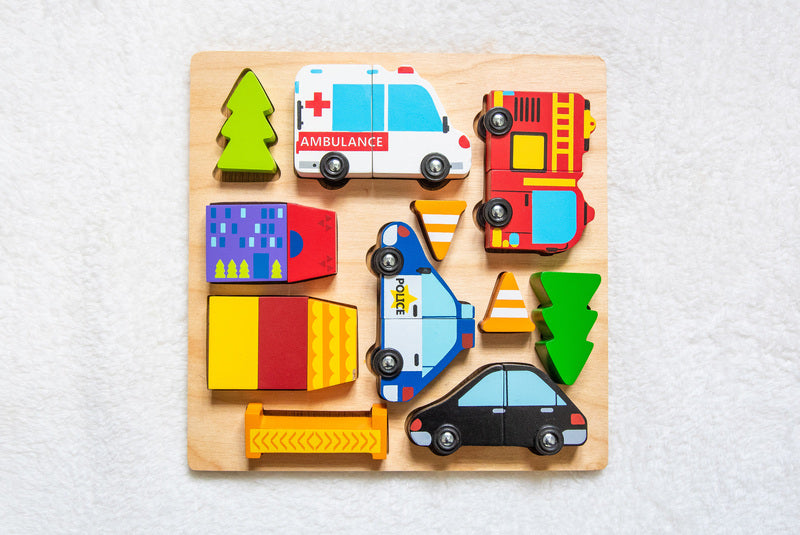 What adventure will you go on? A bright chunky car puzzle with emergency vehicles where the cars can be mixed and matched with magnetised pieces. The puzzle opens up a world of open-ended play with wooden trees, cones and buildings.