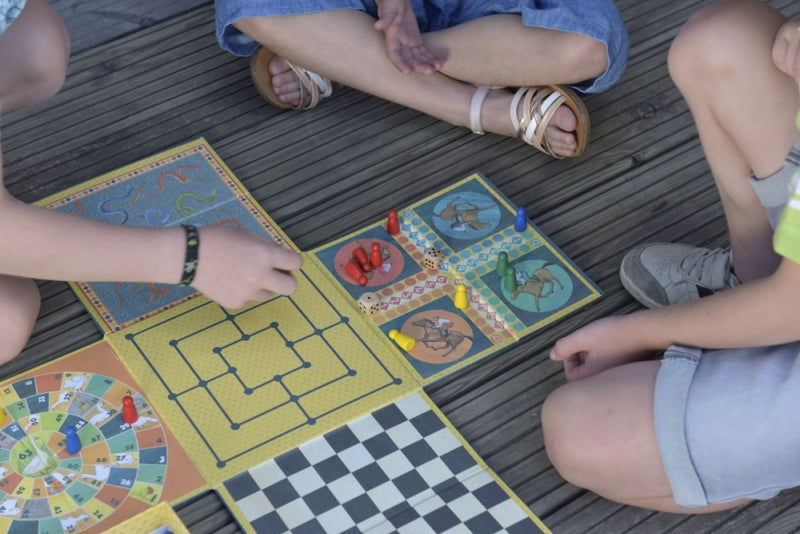 5 games in one box: chess, the game of the goose, ludo, Morris men and Snakes and Ladders. Boards, dice, chess pieces, and rules (10 languages), everything is included in this practical box. Ideal for traveling.