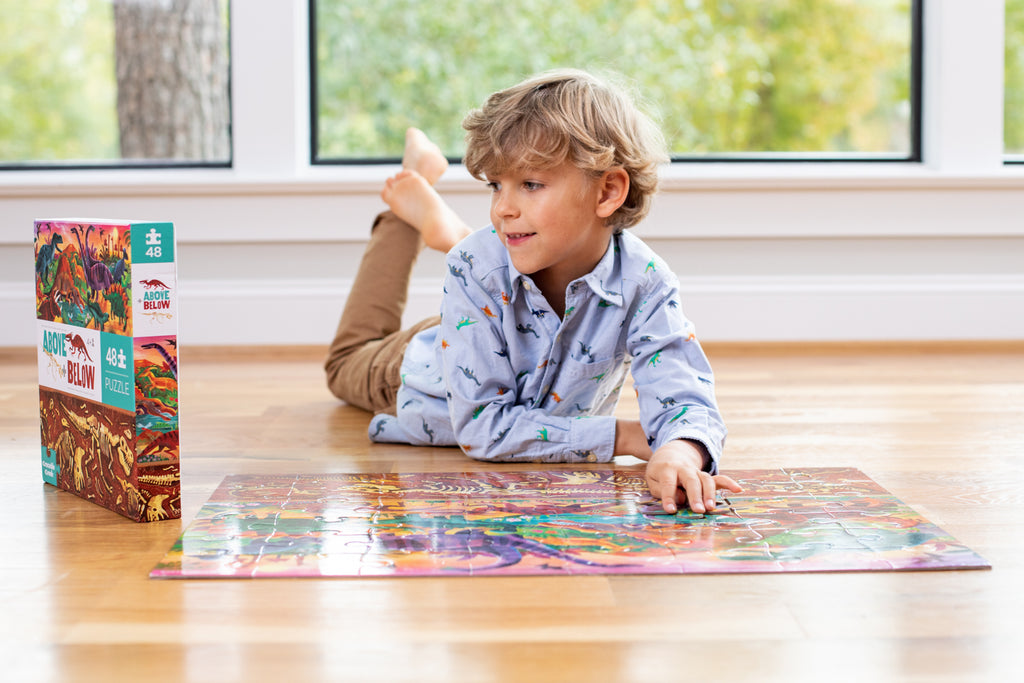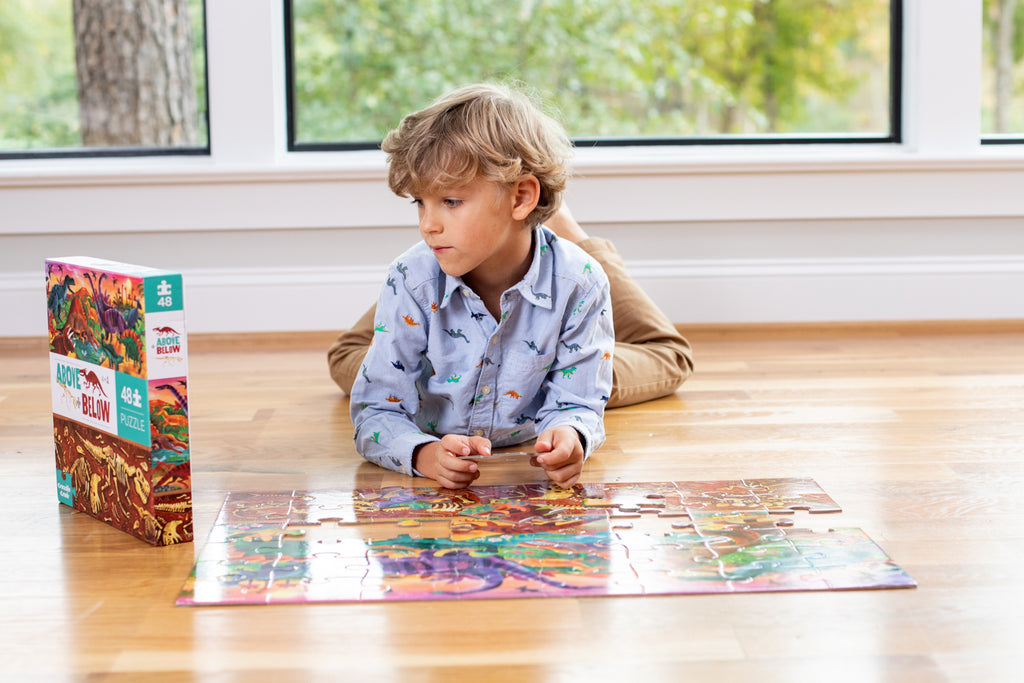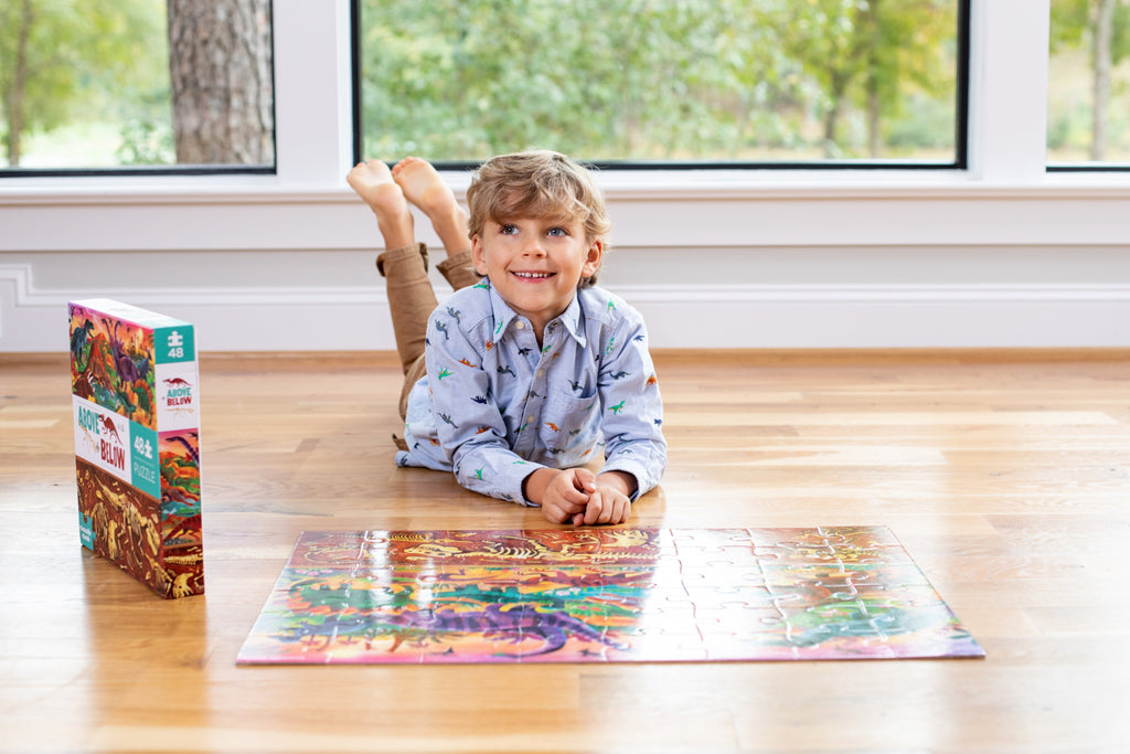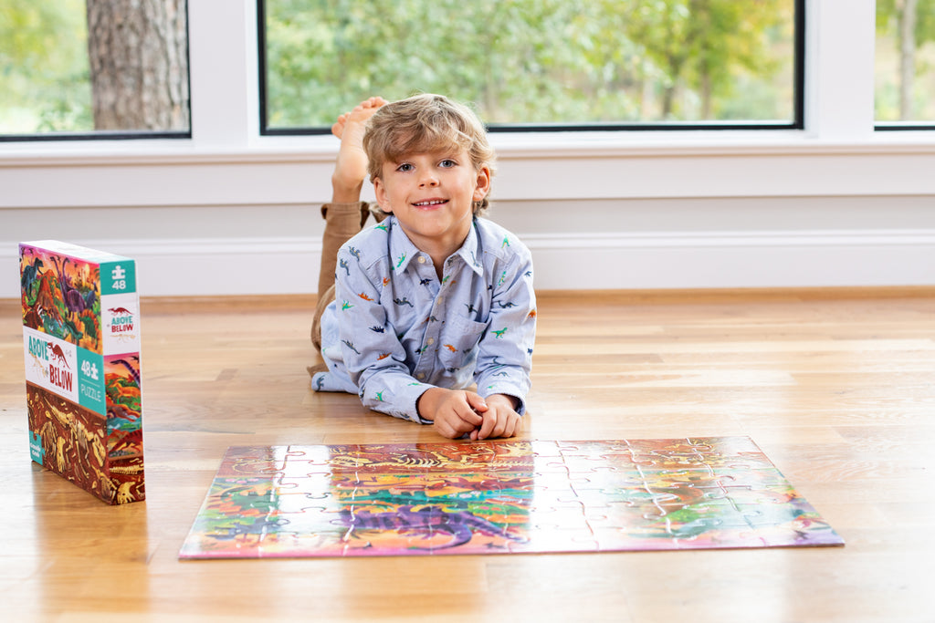 Introduce inquisitive children to the concept of opposites with this celebration of dinosaurs, both above and below the earth. The jumbo, sturdy pieces of this 48-piece, high-quality floor puzzle are ideal for little hands.