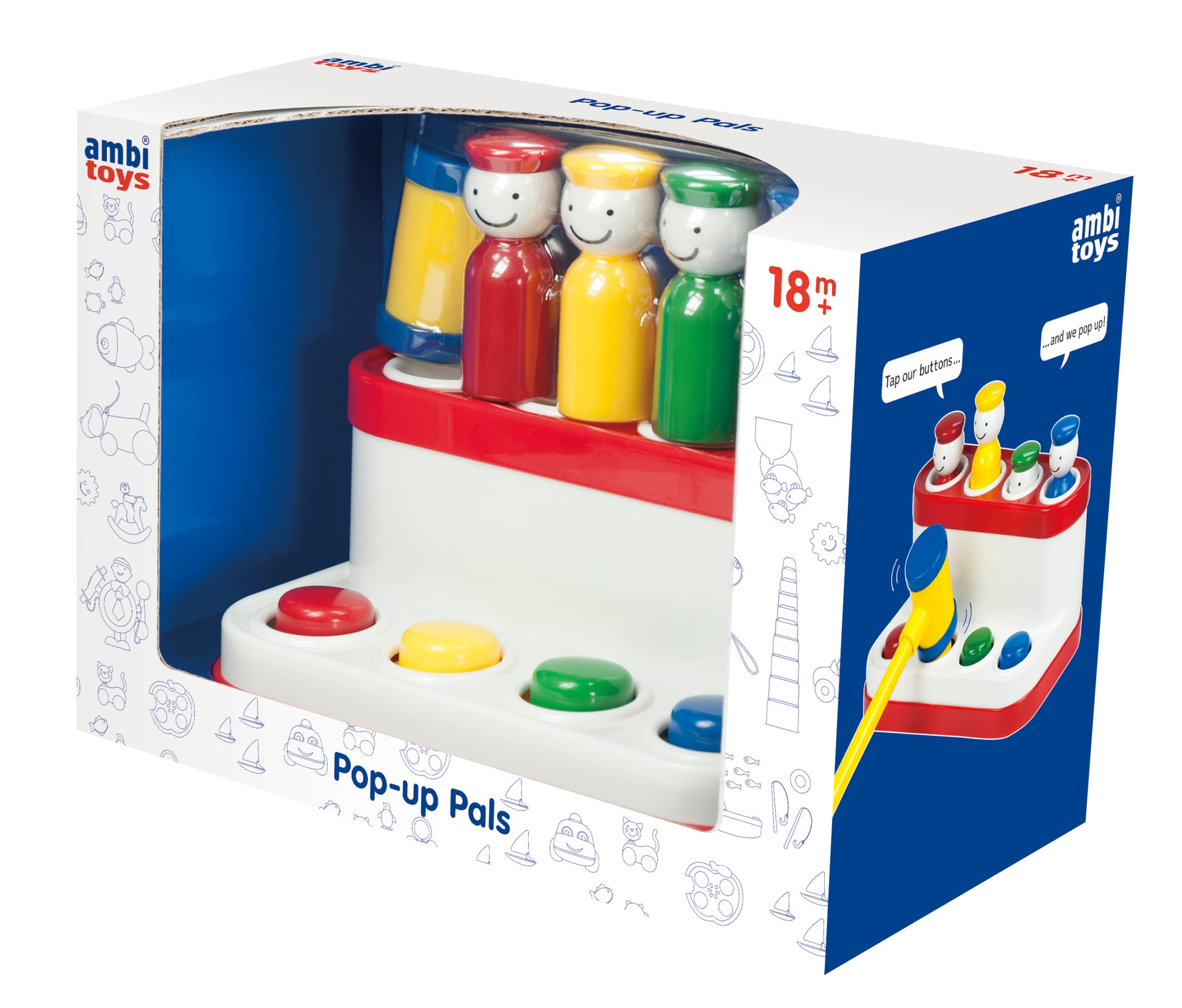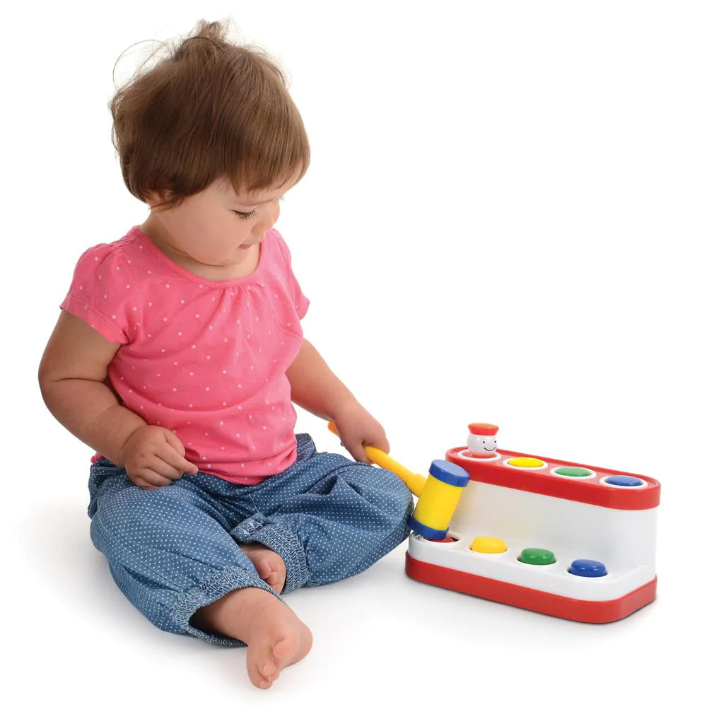 Pop Up Pals bring so much joy and intrigue! Tap a button with the hammer and the matching coloured pal pops up. Repeat the fun game of peep-o with the four smiley pals. Helps develop hand-eye coordination and manual dexterity.