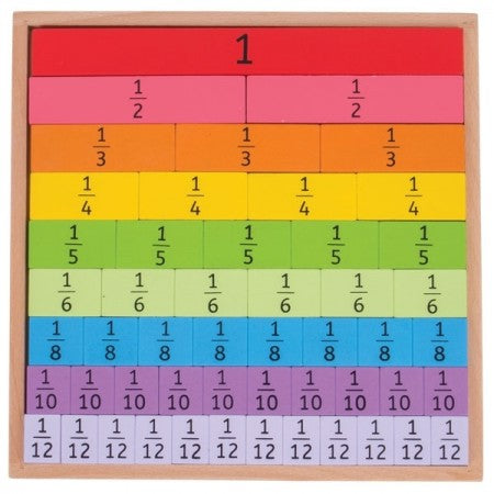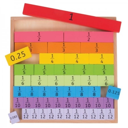 These brightly coloured wooden toy keeps young minds fully engaged as they learn fractions from 1 to 1/12. Then as they master each fraction they can learn about its decimal equivalent printed on the back of each tile.