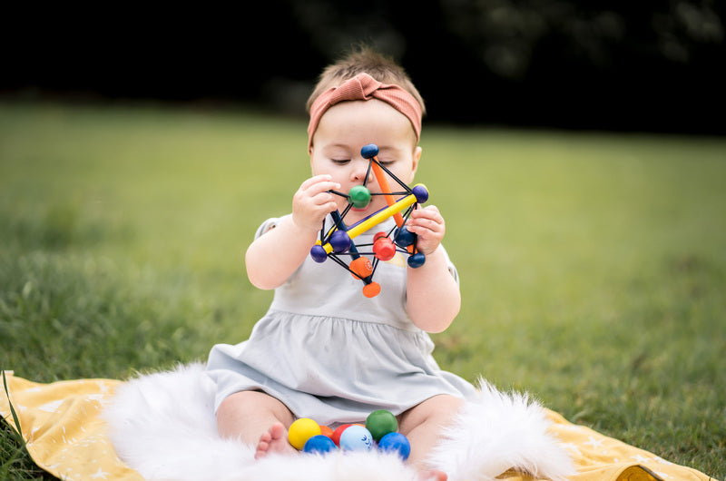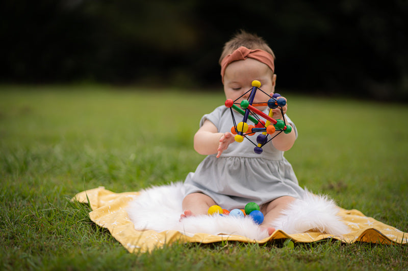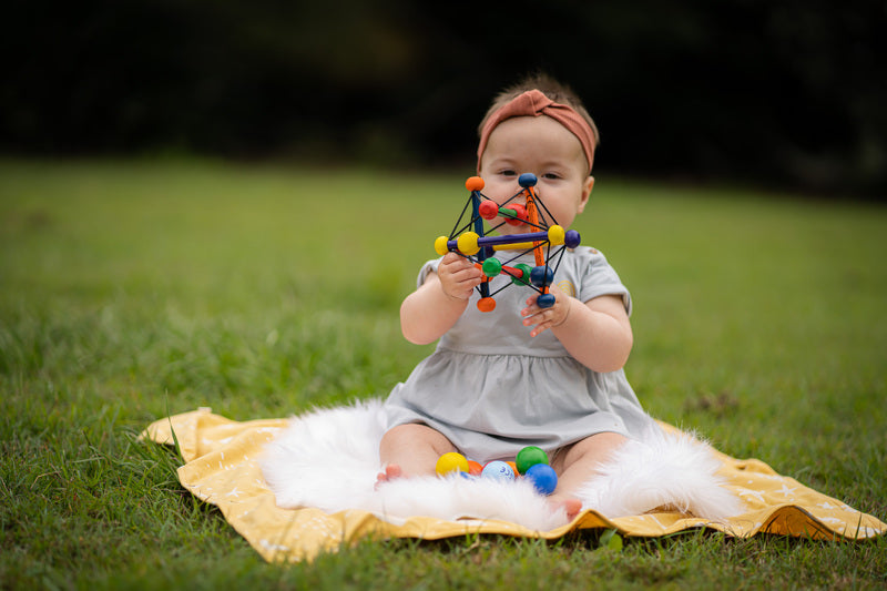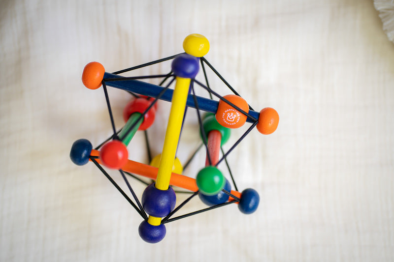 The award-winning Skwish is a world-renowned one-of-a-kind wood rattle and teether toy. Its name comes from its fantastic design. It Skwishes and returns to its original shape, with beads that slide and rattle.