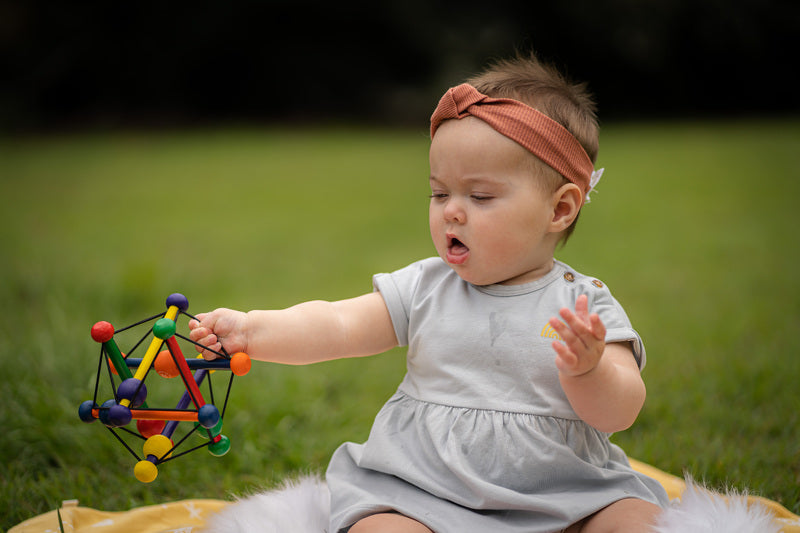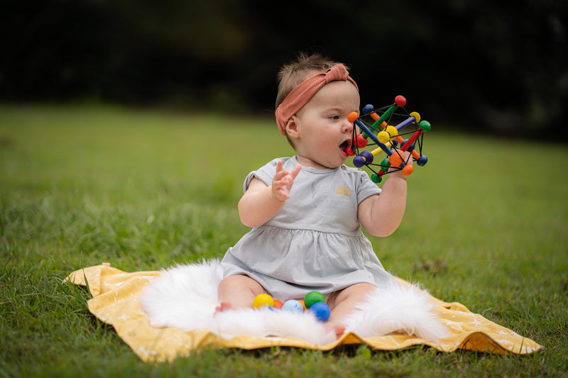The Skwish is a great multi-sensory toy that introduces cause and effect while encouraging the development of gross motor skills such as grasping and reaching. The Skwish is made from sustainable rubberwood. Comes unboxed.