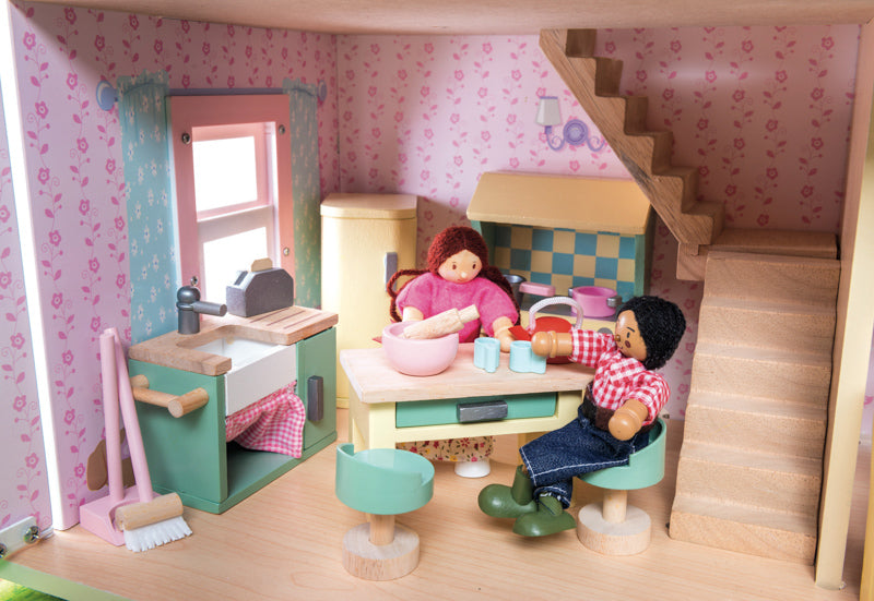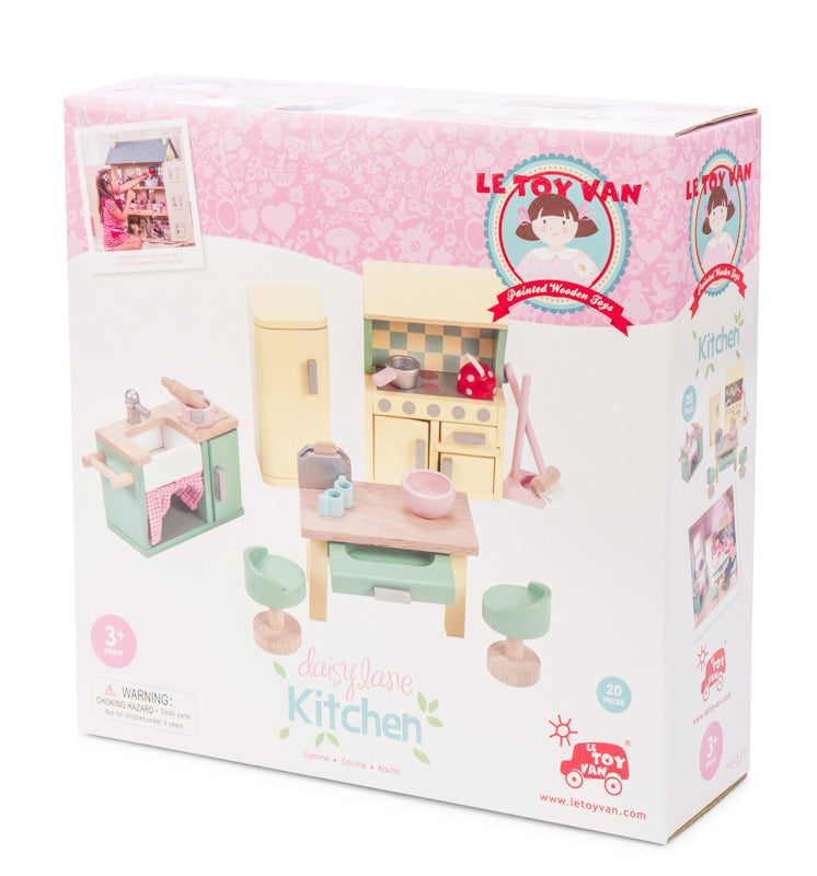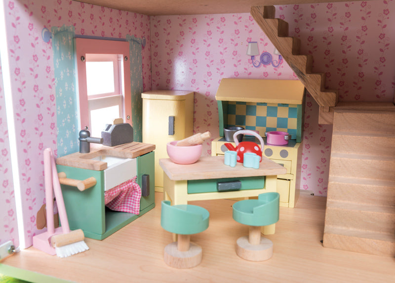 A painted wooden furniture set including a butler's sink, a range cooker with opening doors; an opening larder fridge, a work table with two stools lots of fun play accessories.