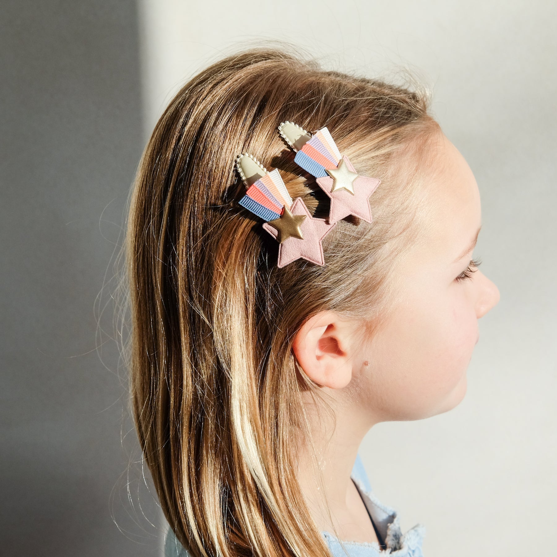 Reach for the stars with these beautiful layered star and ribbon clips! In soft pink suedette and gold glitter with brightly colored grosgrain ribbon trails, these look great clipped in the side of the hair or to decorate an up-do.
