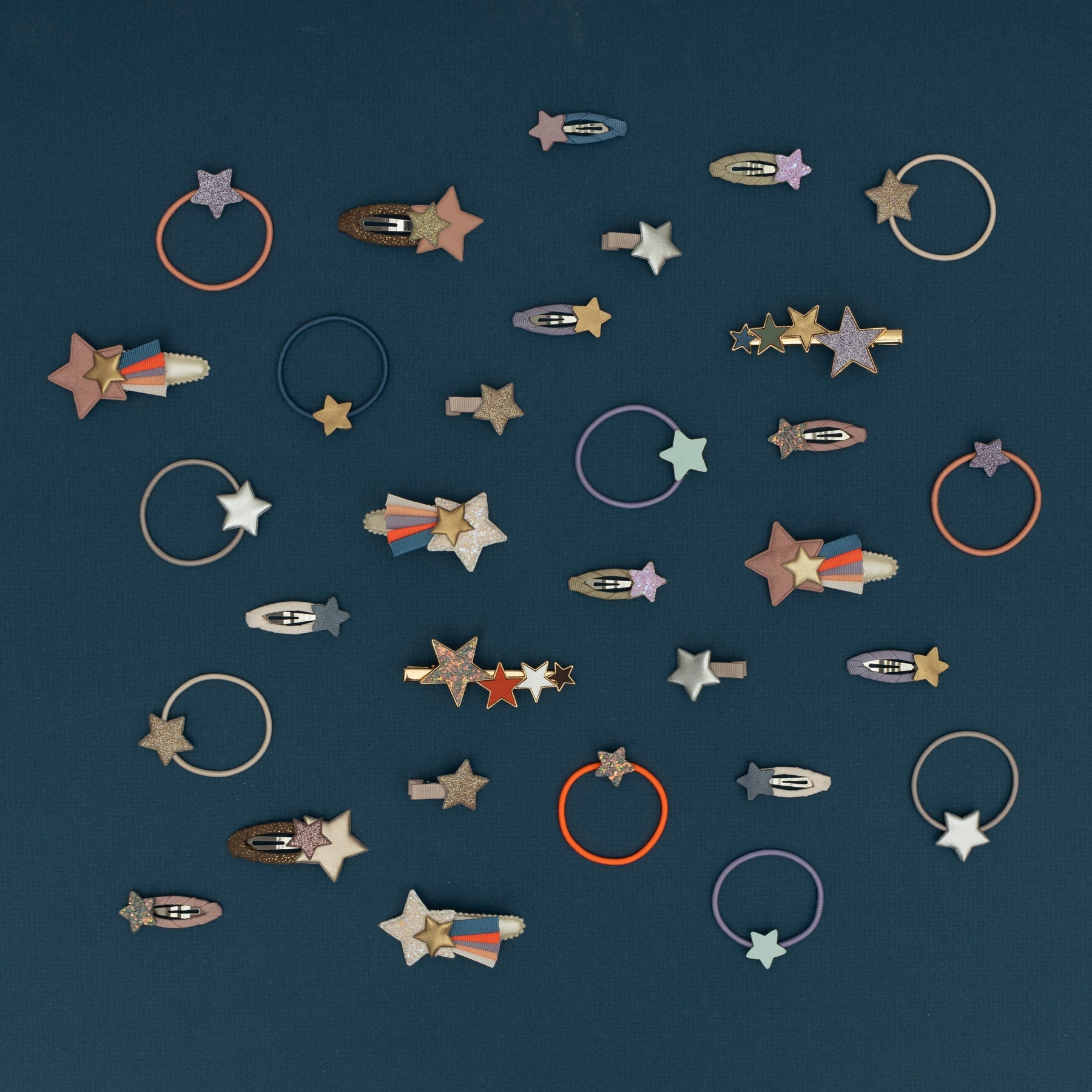 2 in a pack5cm matt metallic fabric covered clic-clac3.8cm padded suedette star with 2cm smaller metallic star and grosgrain ribbon trailCaution! Not suitable for children under 36 months