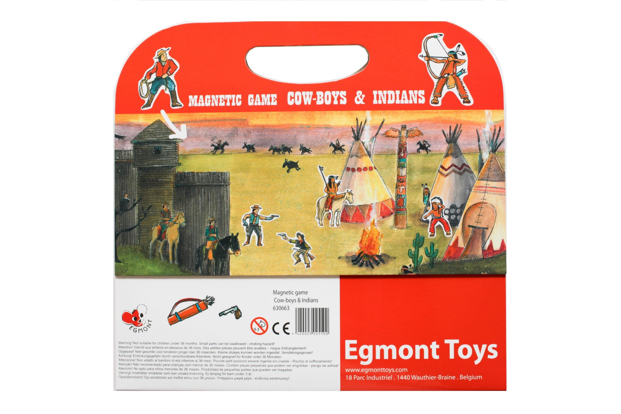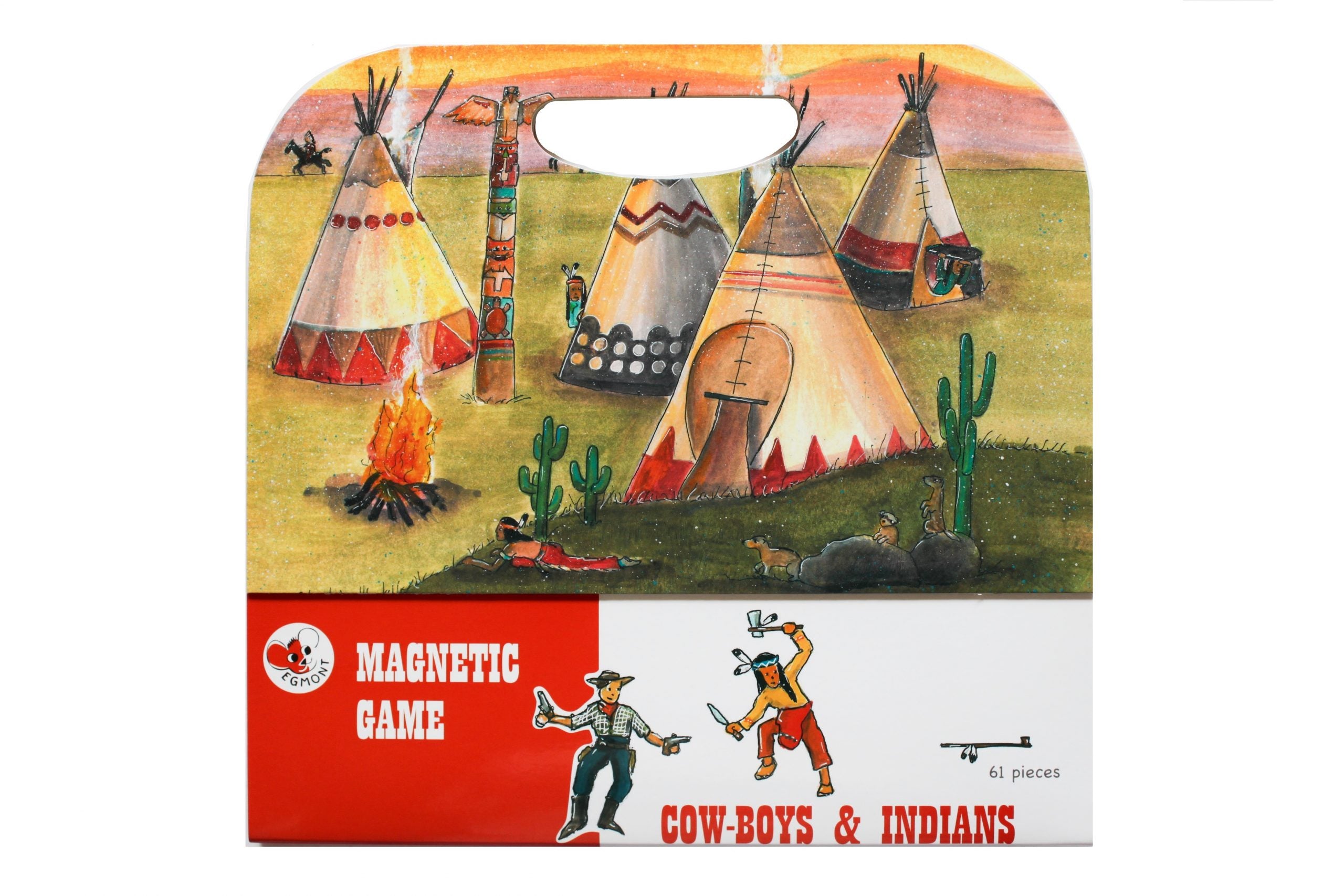 This magnetic Cowboys and Indian playset features a fold-out baseboard with 61 pieces of Cowboys and Indian items with a medieval design. It can be easily stored and comes with a carry handle.