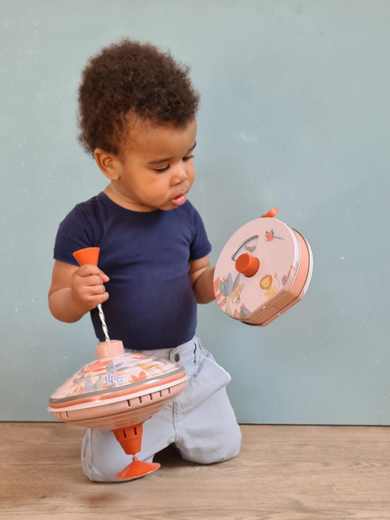Wind up with the big button in the centre and the music starts to play. Easy to take with you wherever you go with the handle on top. 10 months+