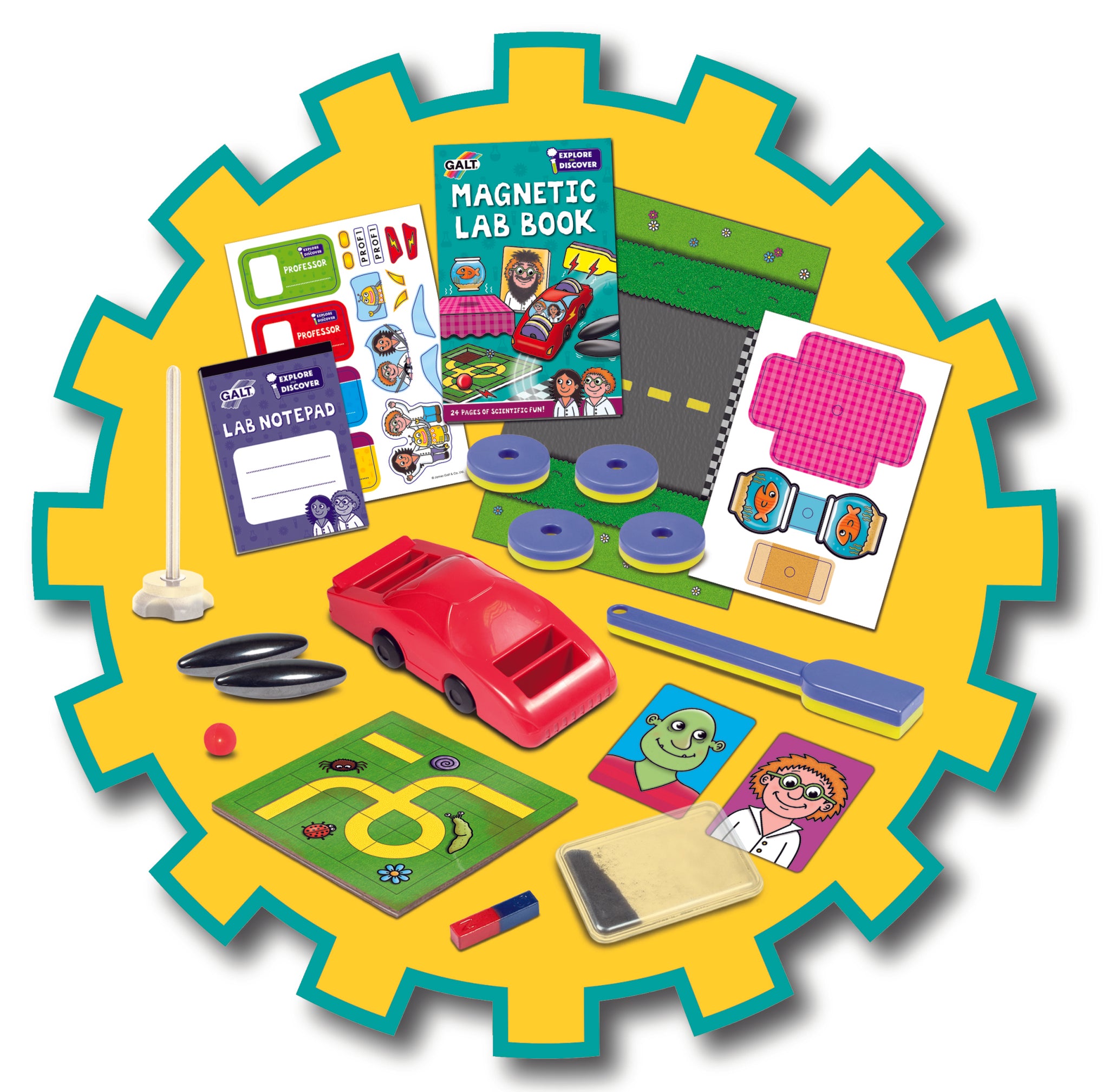 Contents: magnetic wand, plastic racing car, racetrack poster, 4 ring magnets, levitation stand, iron filings capsule, 2 vinyl face stickers, 2 rattle magnets, a bar magnet, marble maze board, marble, stickers, printed card pieces, notepad, and 24-page Lab book.
