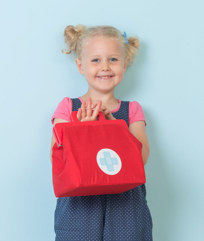 A vintage style, child-sized, fabric Doctor's Bag filled with wooden medical instruments and bottles. The set includes a toy stethoscope, thermometer, syringe, blood pressure gauge, ear scope, reflex hammer, scissors and two medicine bottles. The cardboard packaging includes a cut-out play card prescription to extend the play.