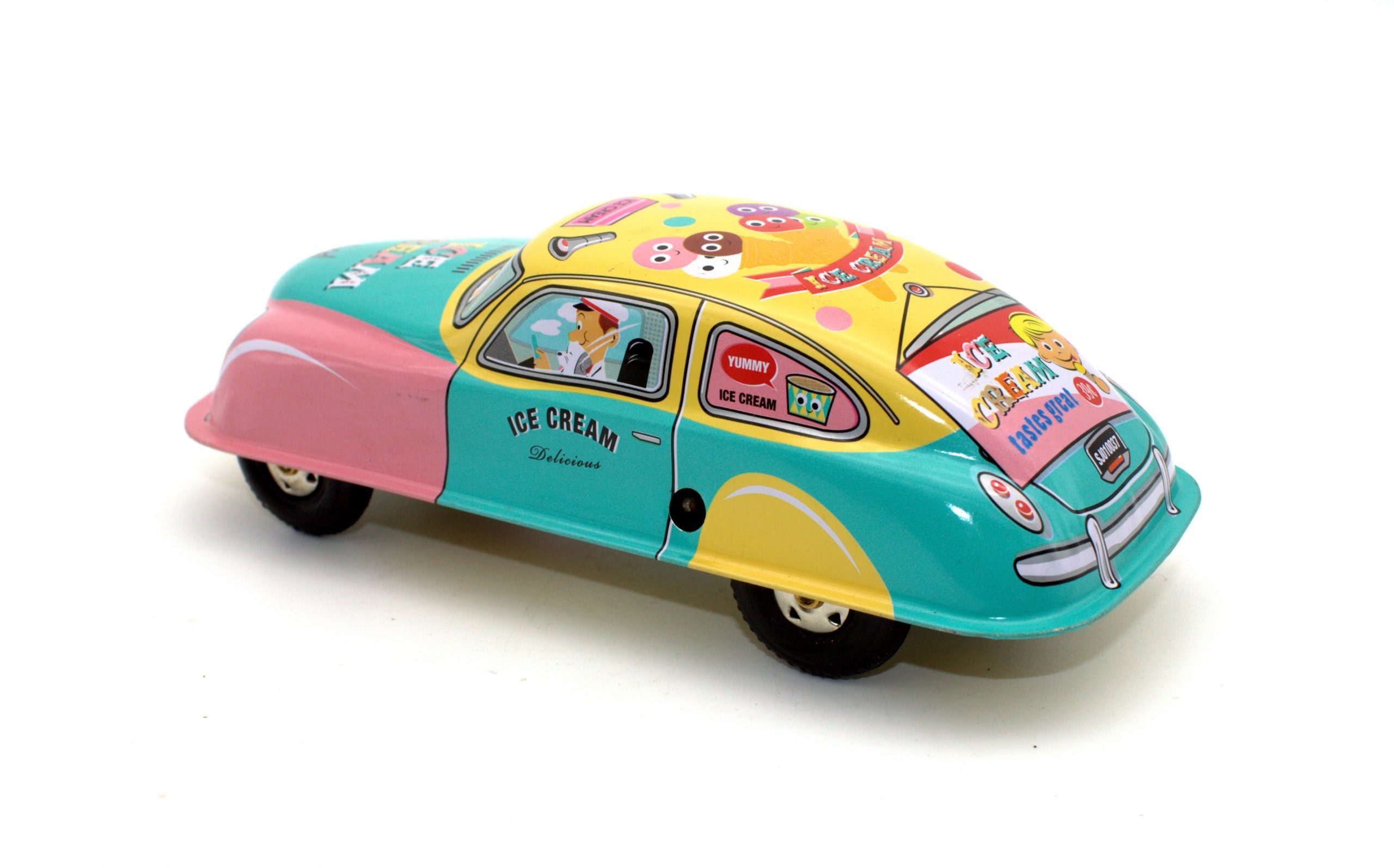 Ice cream wagon car by Saint John. Unique Collectible retro wind-up tin toy. Hand-assembled and machined stamped with beautiful pastel pink, aqua, and yellow colors.