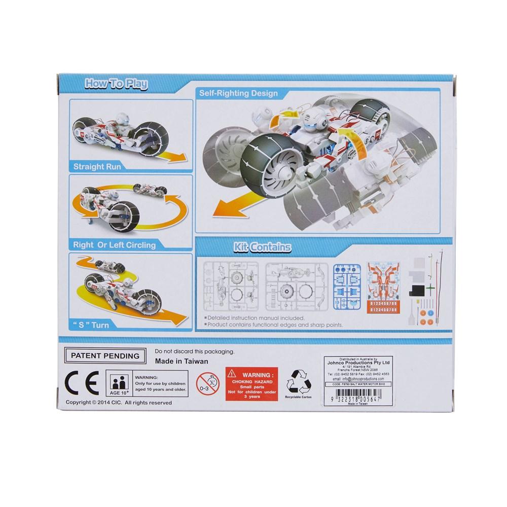 The Salt Water Fuel Cell Motorcycle is equipped with cam and swing arms, the multiple variations allow for full-throttle excitement: powerful straight runs, right or left circling, and radical “S” turns. Children will be awed by the remarkable simplicity and effectiveness of the toy.