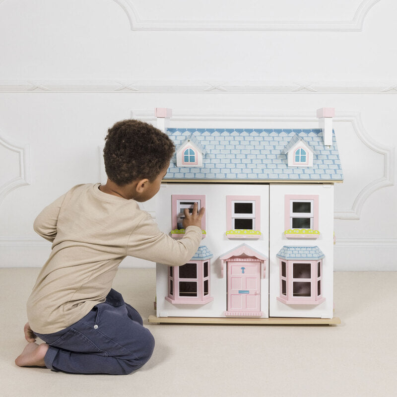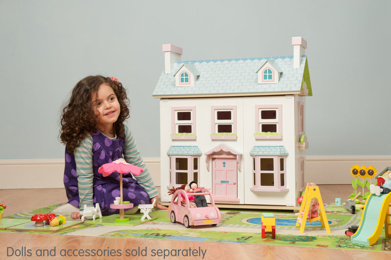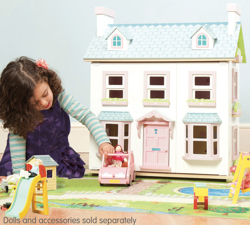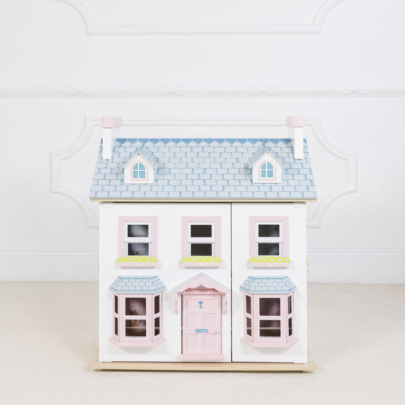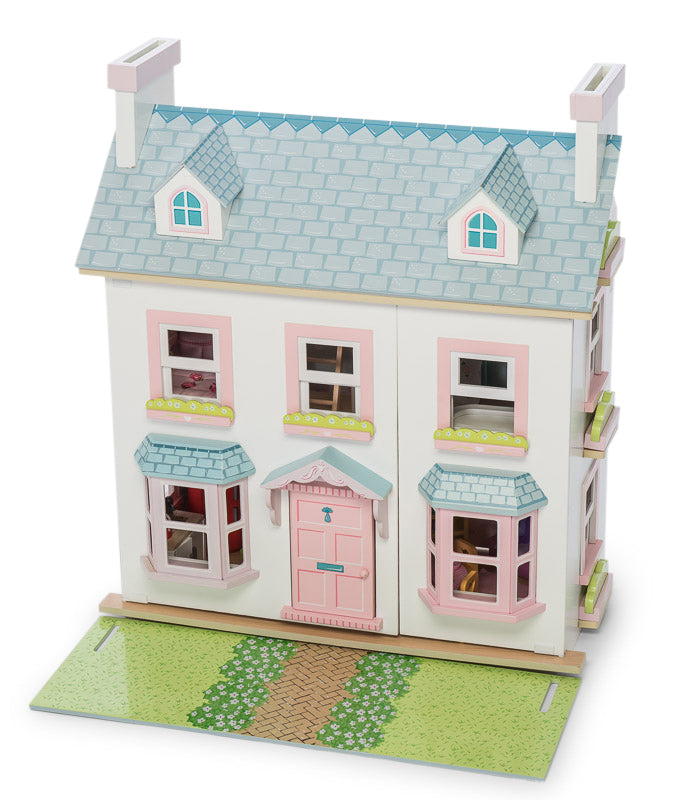 A deluxe, fully painted and decorated, large, three storey doll house with attic windows and chimney stacks. Features include large bay windows, room dividers, a loft ladder, opening sash windows, and a reversible roof panel to form a garden path.