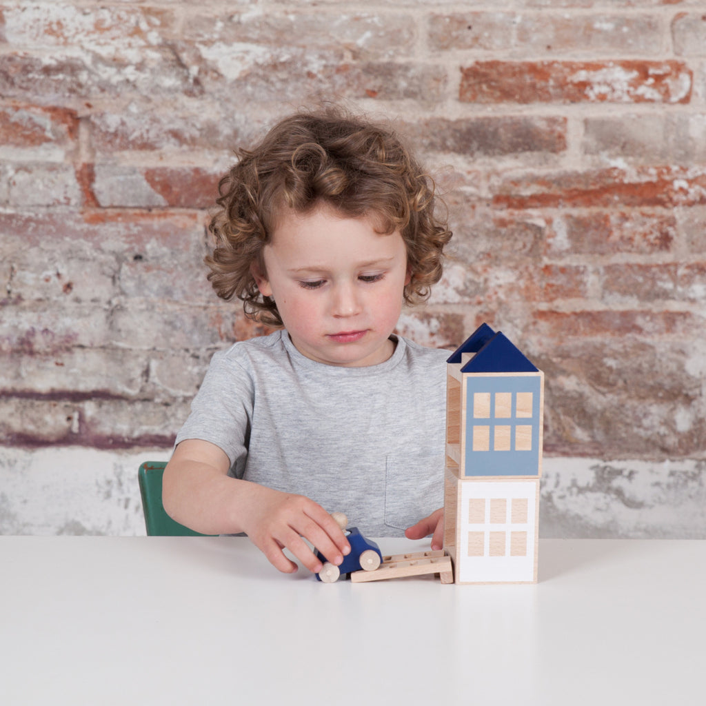 This unique toy with a subtle design in blue and grey allows children to create different buildings and enjoy a fun time with their own constructions, the wooden toy cars and the little people.