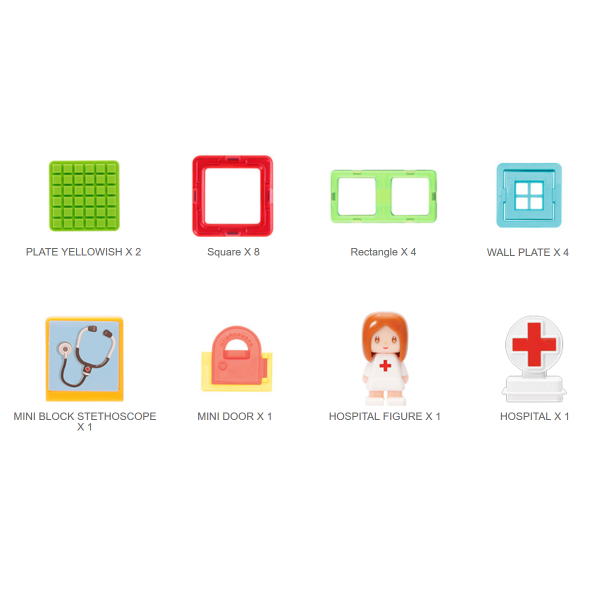 The Set Contains 4 Rectangles, 8 Squares, 1 Hospital Sign, 2 base plates, 1 Medical block, 1 Mini Door, 1 Doctor and 4 Wall Plates.