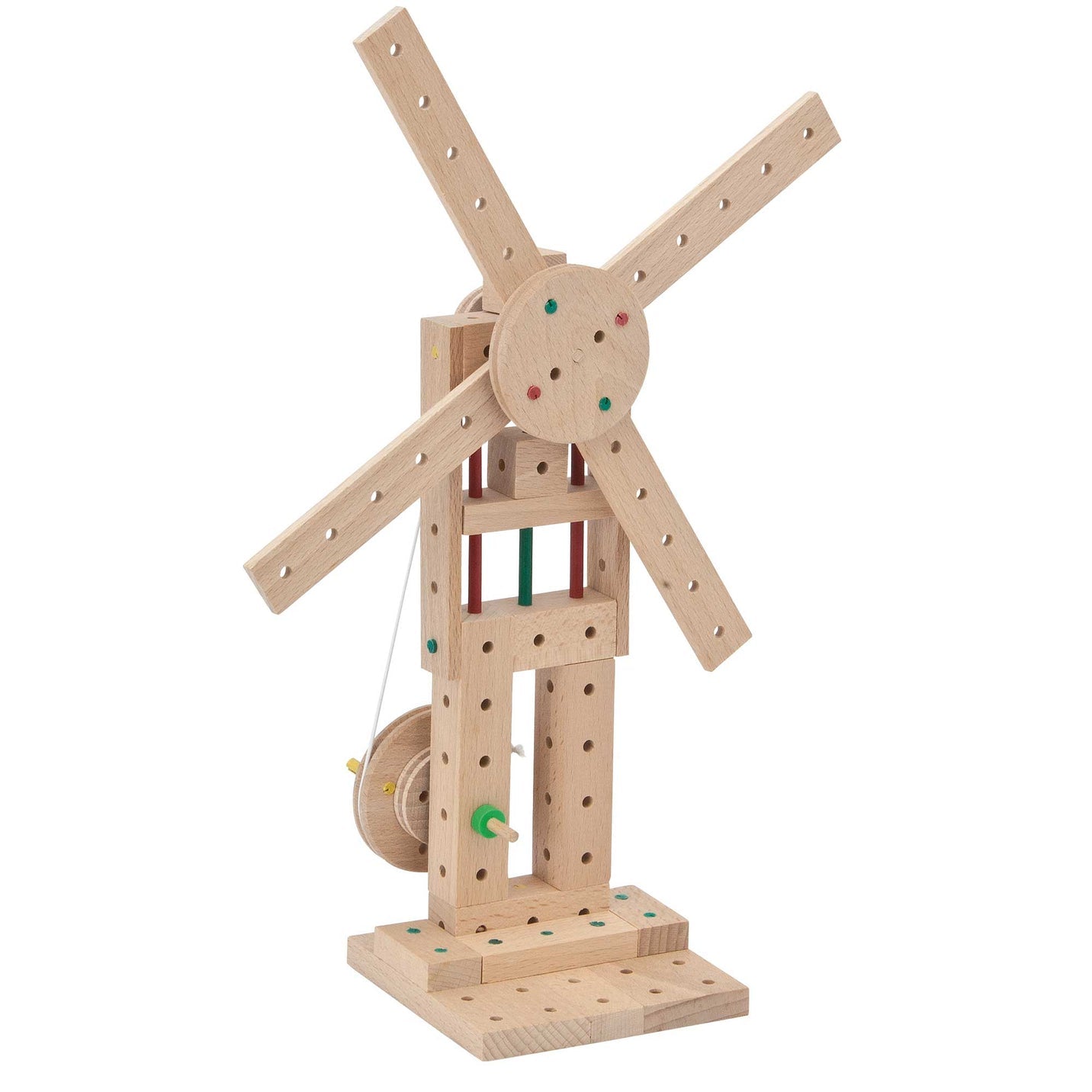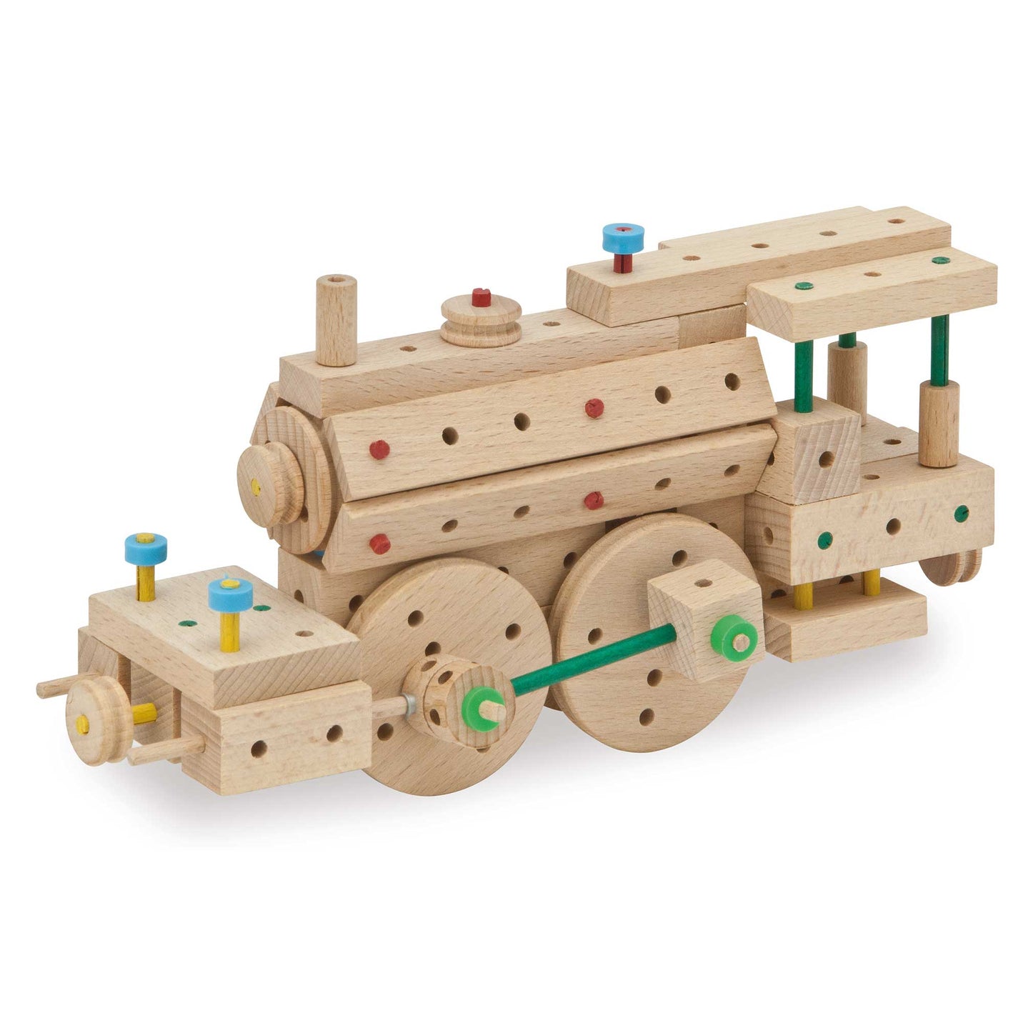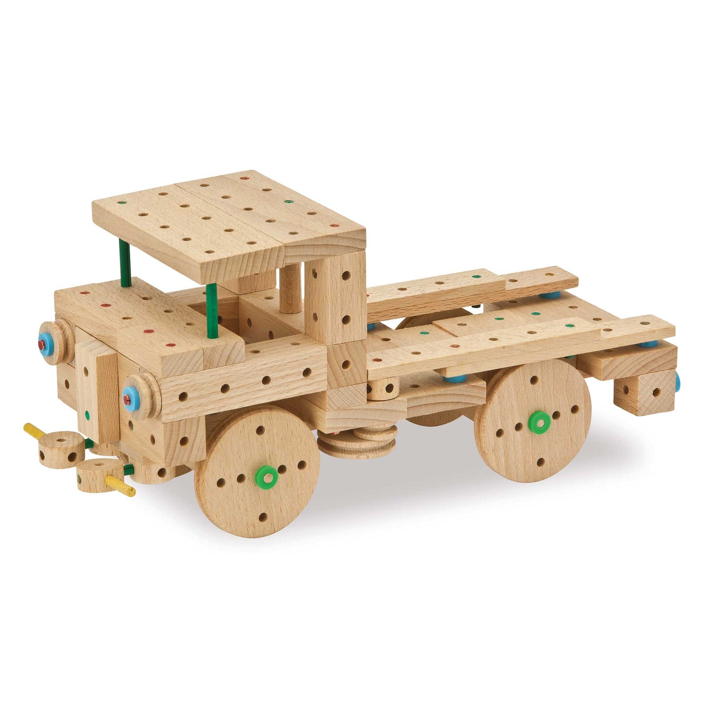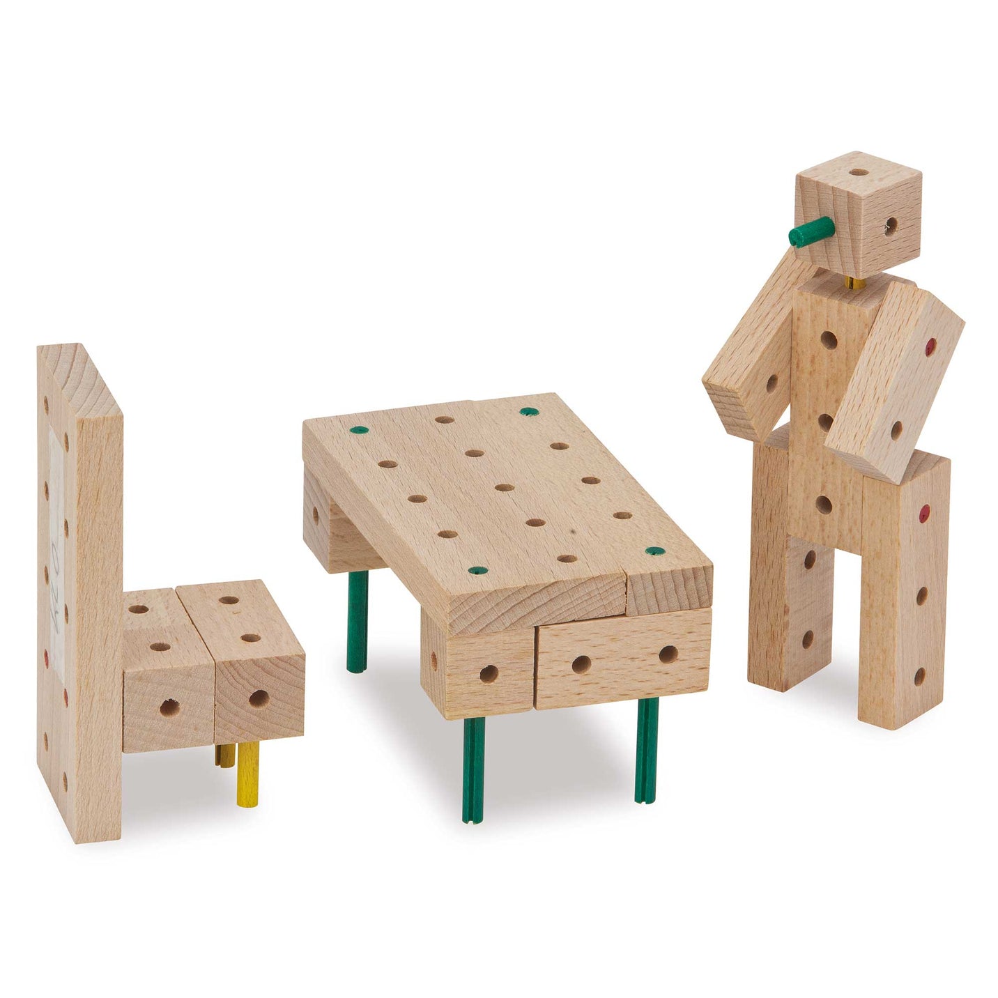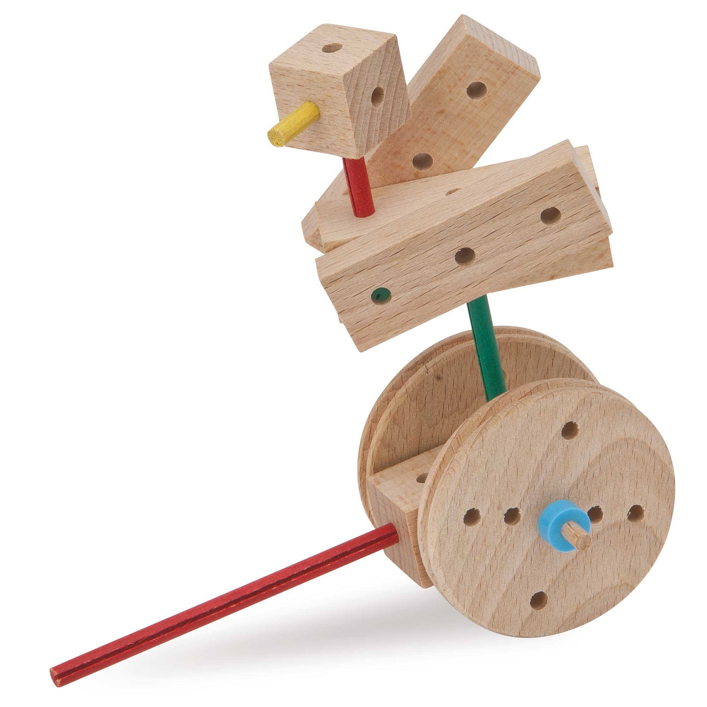 This set includes everything one needs for creative construction. Blocks in various shapes and sizes, connecting pins in different lengths, wheels, axles, a building manual, and natural tool sets to play together in a team.