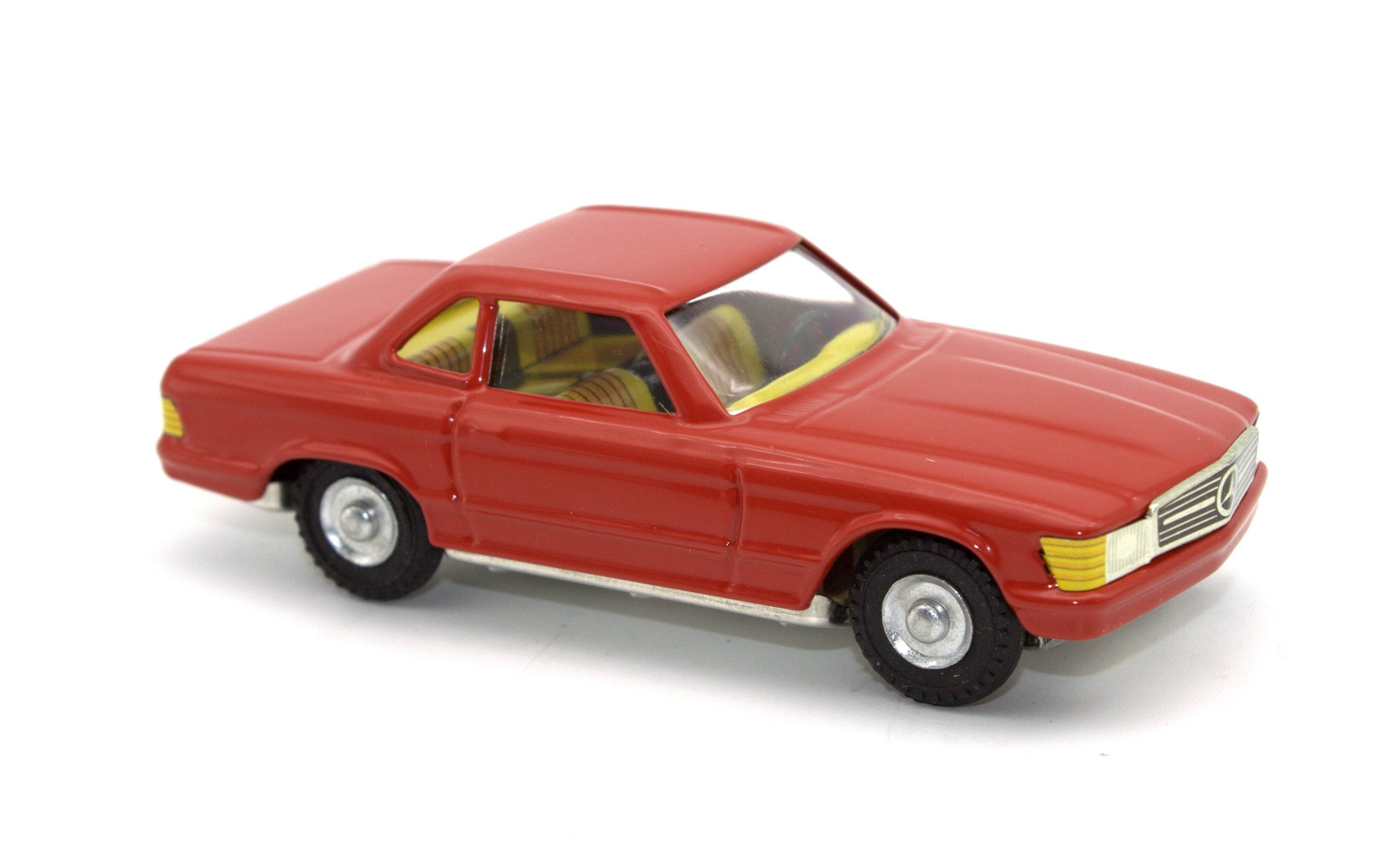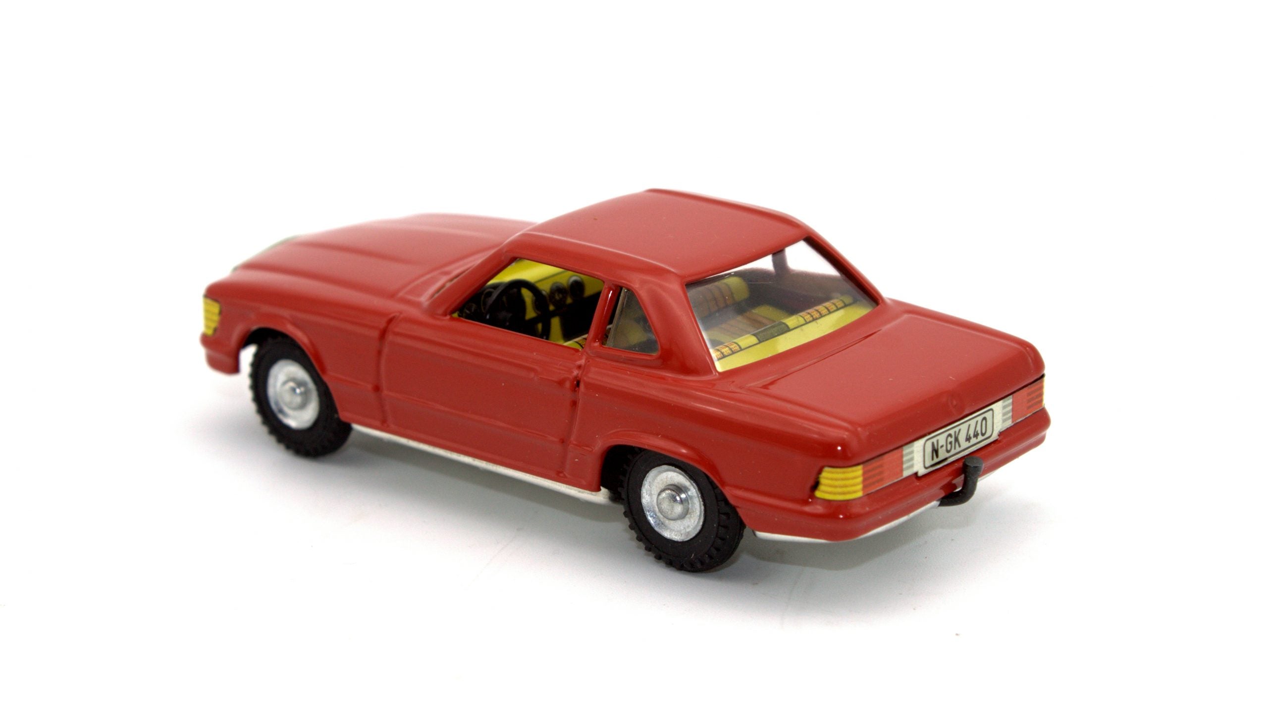 A classic tin toy by famous Czech toymaker Kovap.Retro Mercedes coupe 350 SL is very nicely detailed with fully operational free-wheels, clear windows on each side, a printed interior and a hitch bar to connect the caravan for towing.