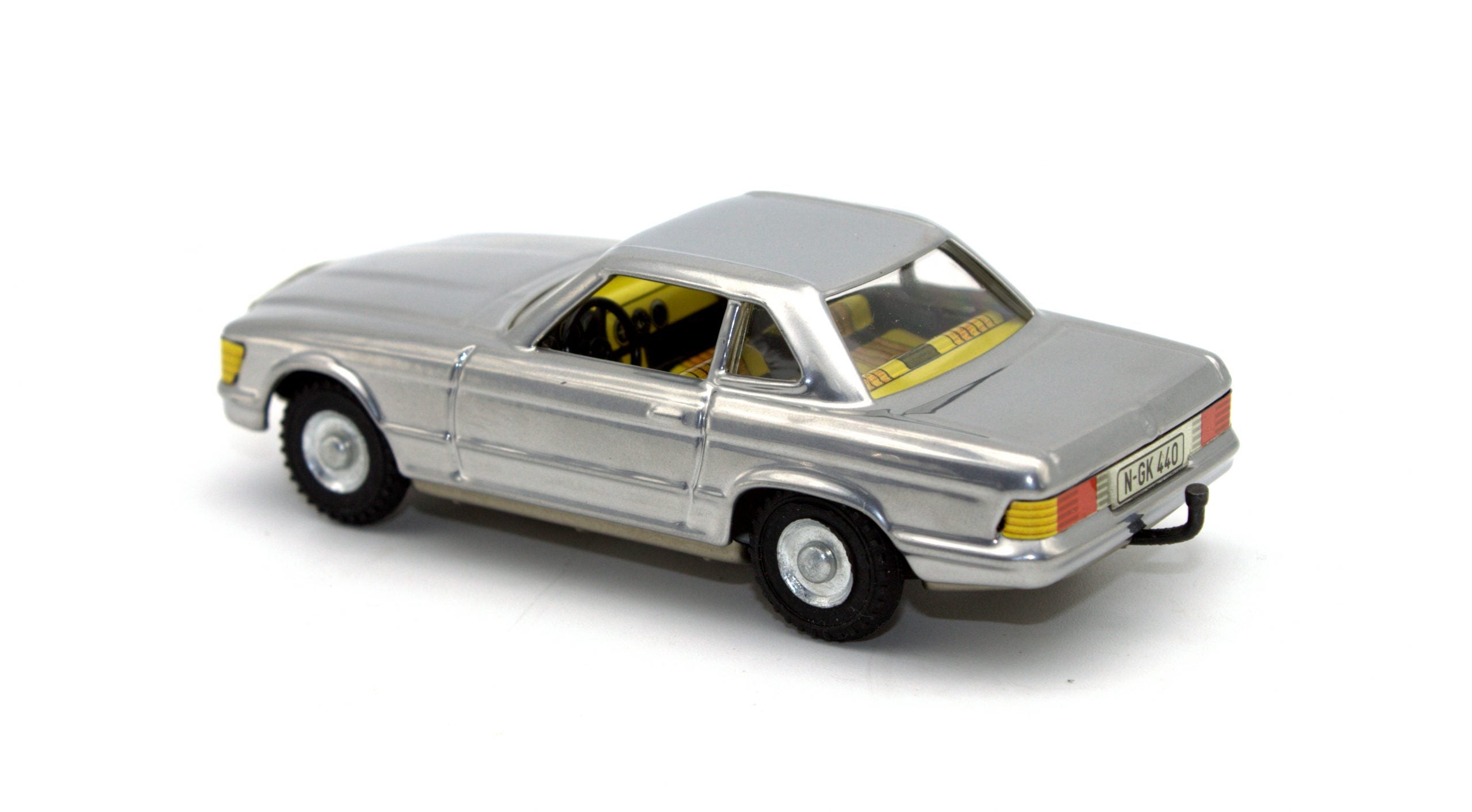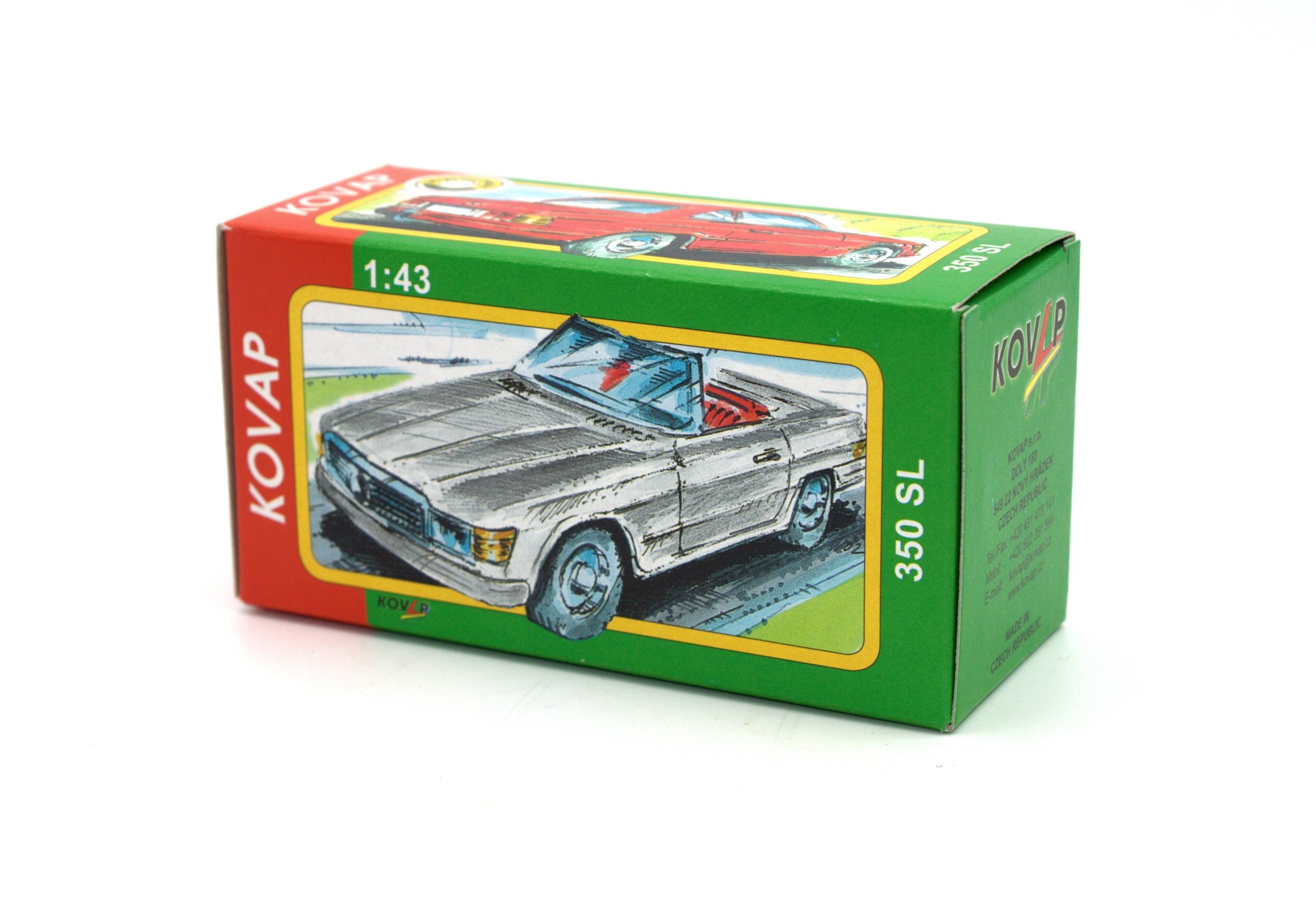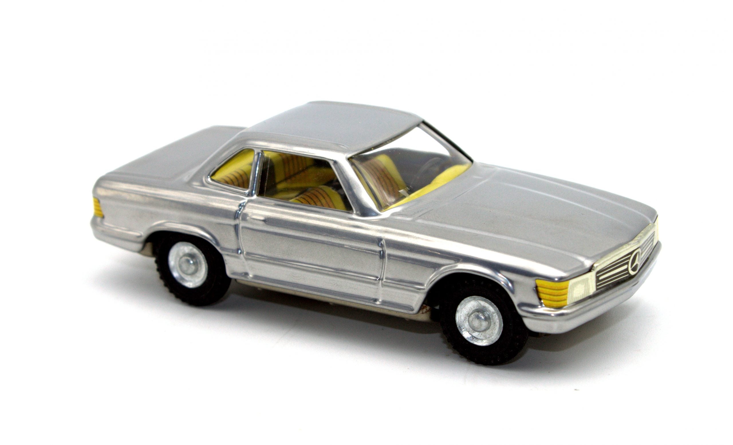 A classic tin toy by famous Czech toymaker Kovap.Retro Mercedes coupe 350 SL is very nicely detailed with fully operational free-wheels, clear windows on each side, a printed interior and a hitch bar to connect the caravan for towing.
