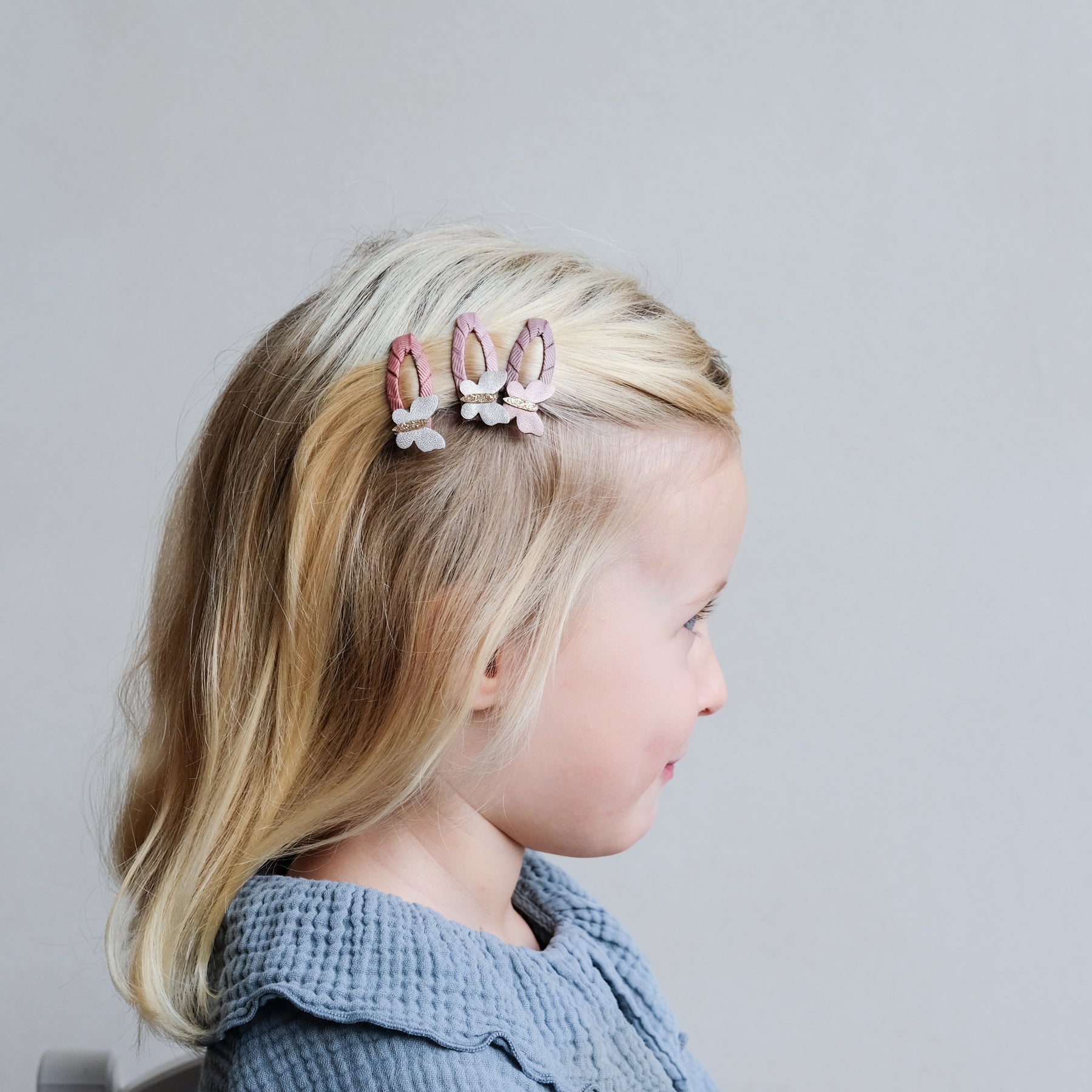 Flutter by little butterflies! The prettiest little pack of ribbon wrapped clips featuring soft metallic and plain leatherette butterflies with super sparkly glitter bodies. These clips are sure to brighten their day!
