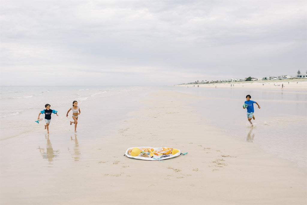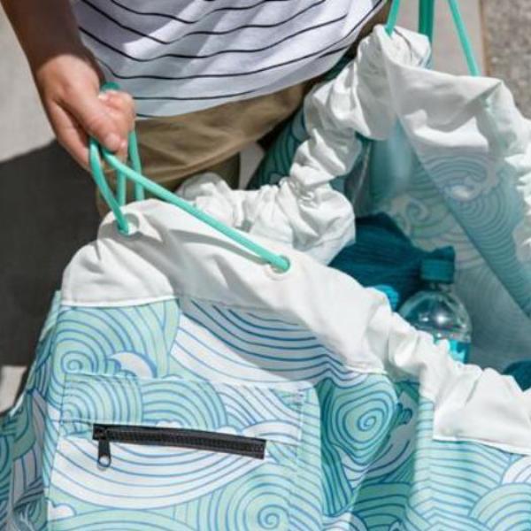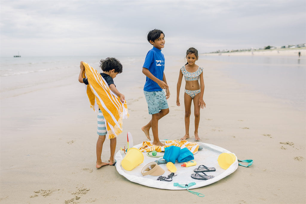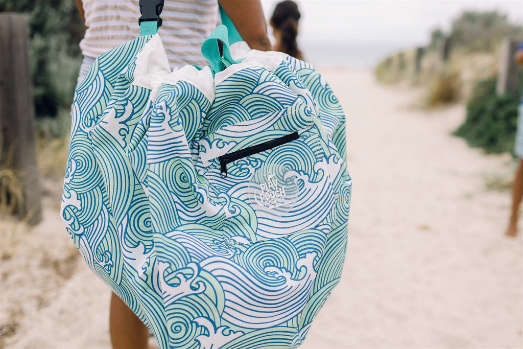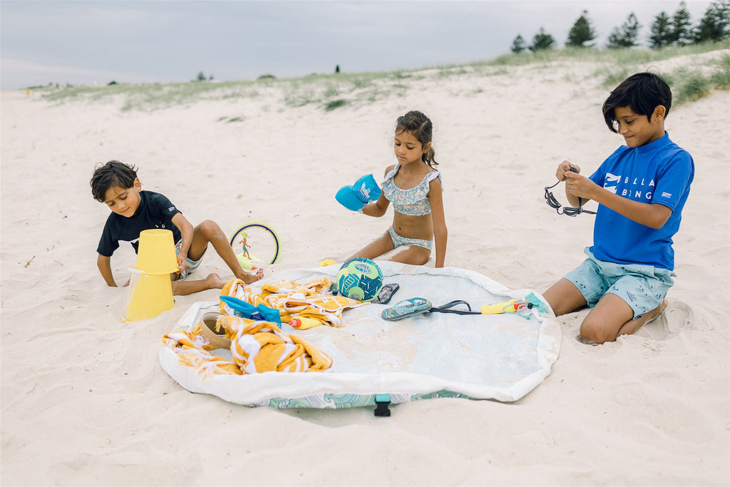 Spread the Aqua Pouch out to sit or play on. If the ground is wet, you will stay dry! Stand on the open Aqua Pouch to get changed. When it is time to pack away, just pull on the ropes, tighten the toggles and you've gathered everything neatly into the Aqua Pouch. The interior of your car or home will stay dry when you pack wet items inside the Aqua Pouch. The must-have summer accessory!