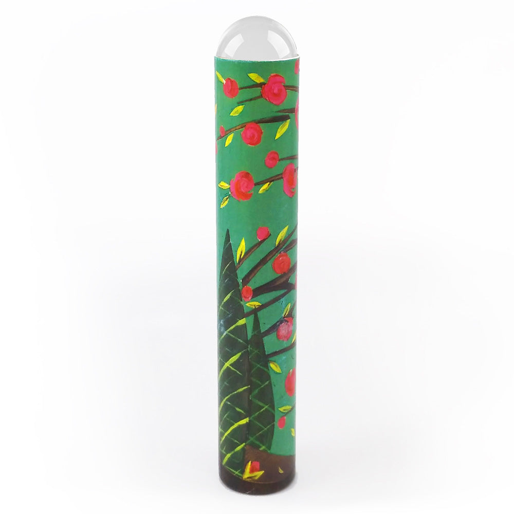 The lens of the kaleidoscope is colored glass and mirror, the reflections produce changing patterns when the kaleidoscope is rotated. The tube is made out of solid cardboard with a forest dance design for durable long-term use.