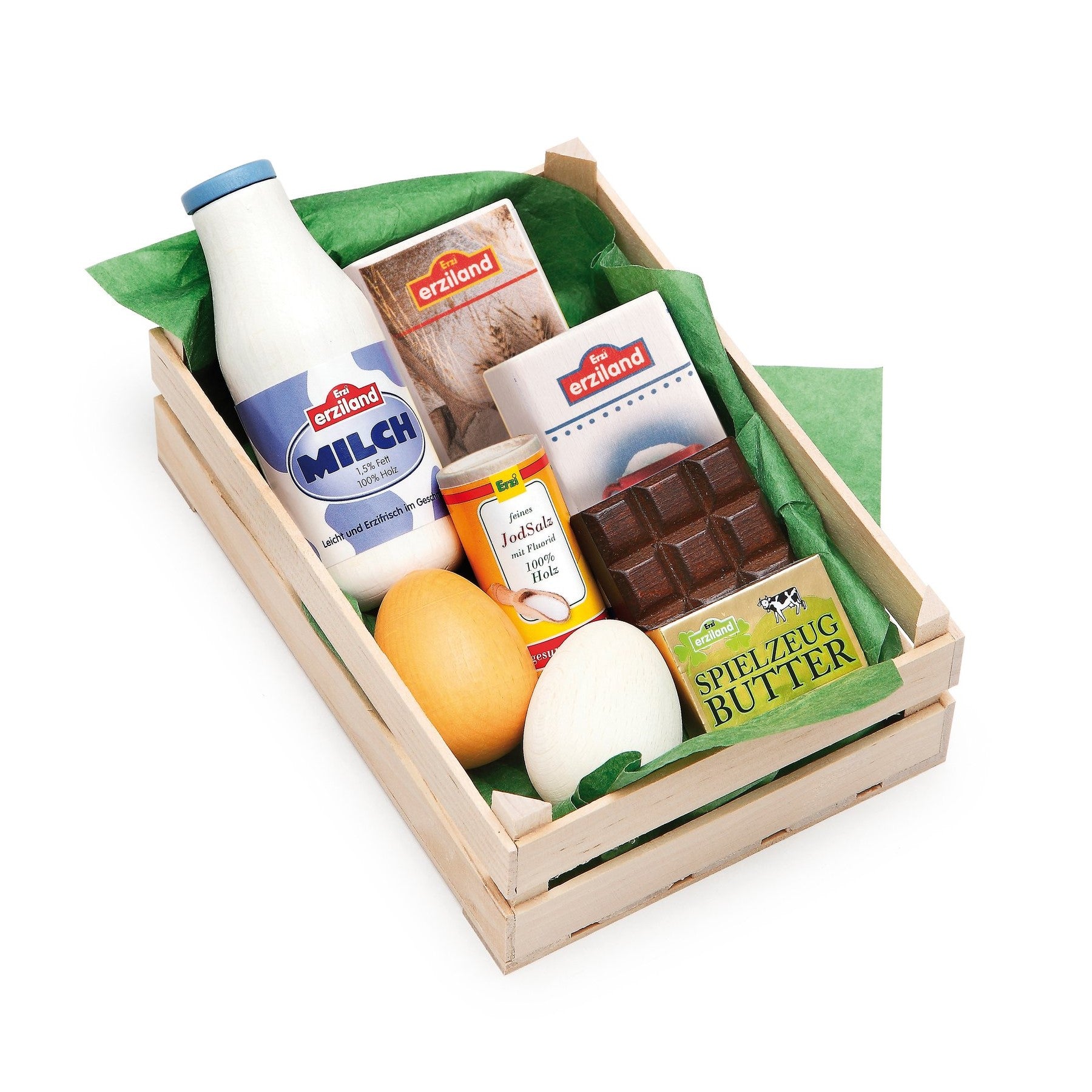This crate contains the following baking ingredients from coloured lacquered beechwood: 1 bottle of milk, 1 flour, 1 sugar, 1 brown and 1 white egg, 1 salt, 1 mini-chocolate, 1 butter