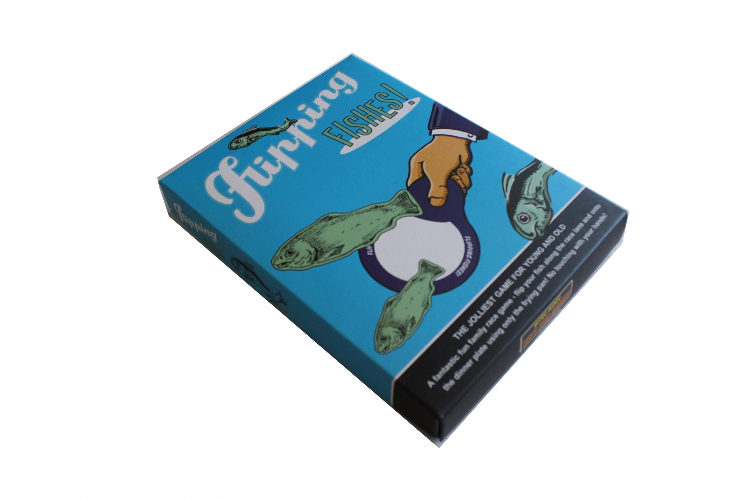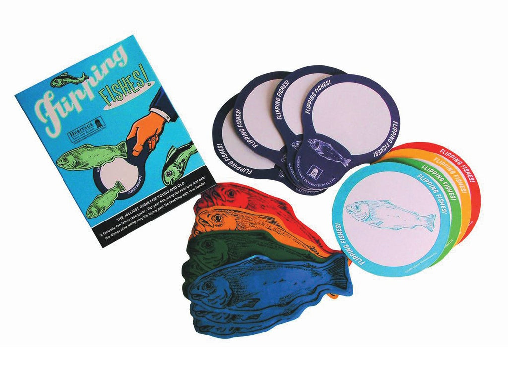 The Retro Board game Flipping Fish includes 12 paper fishes (22.5cm long), 4 cardboard plates and 4 cardboard paddles.