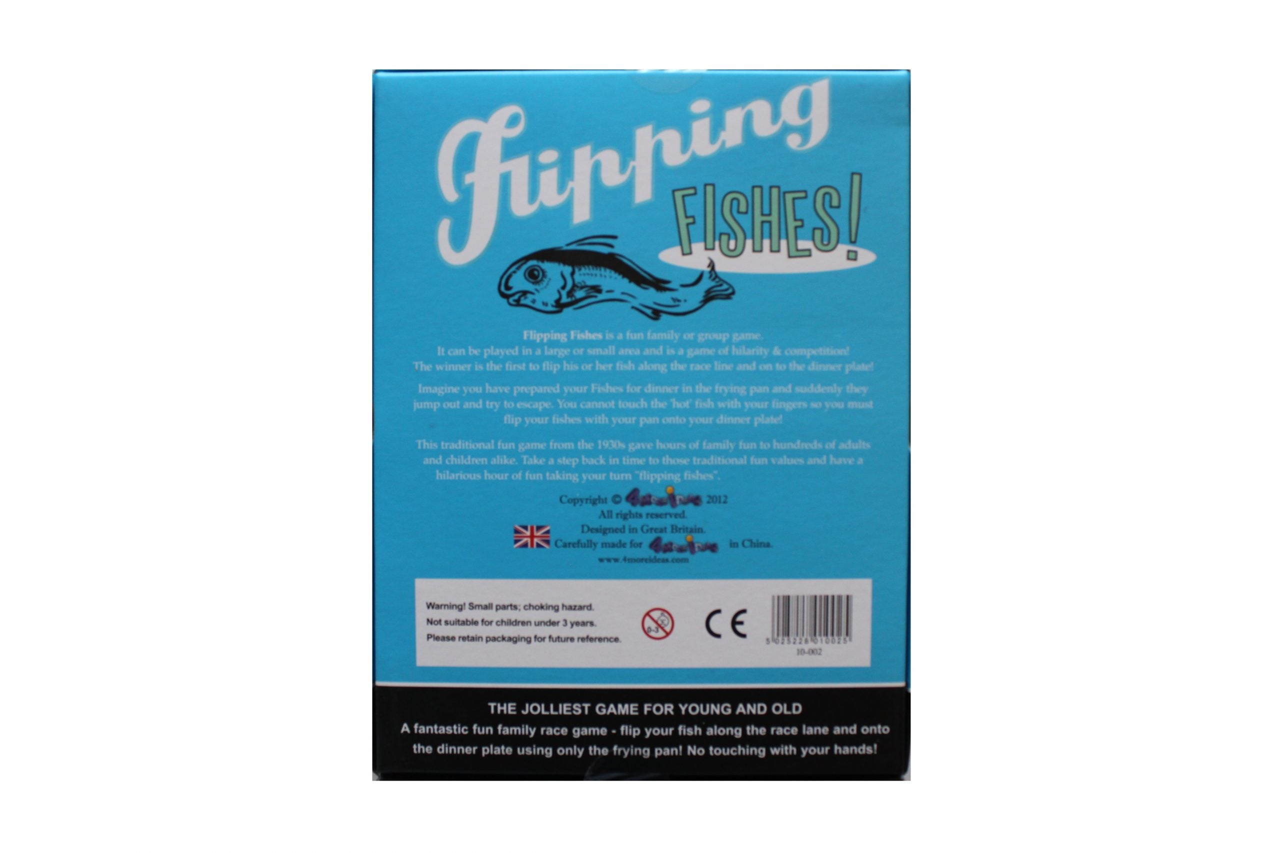The Jolliest Game for young and old. A fantastic fun family race game - flip your fish along the race lane and onto the dinner plate using only the frying pan. No touching with your hands.