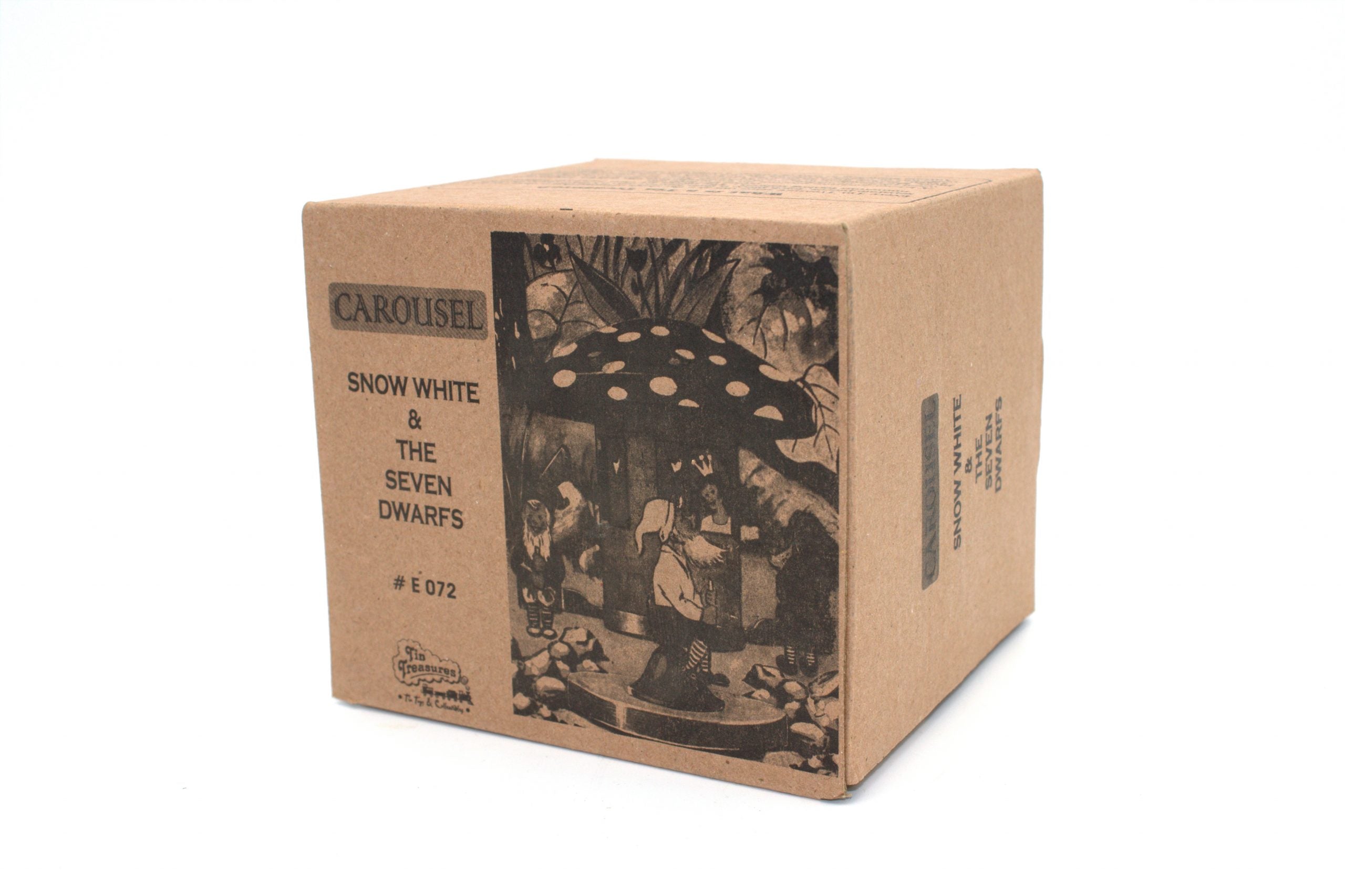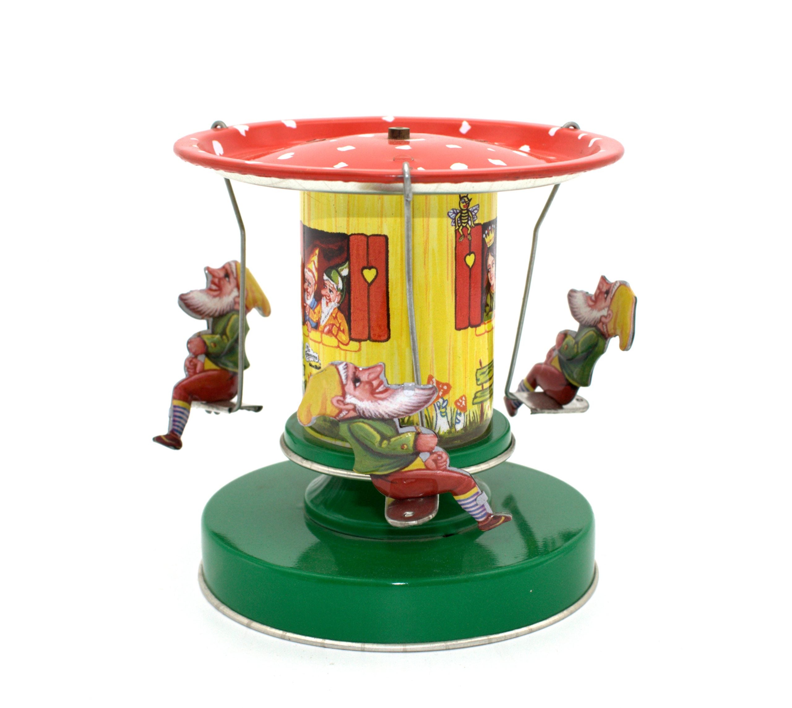 This brightly coloured Snow White and Dwarfs Wind Up Tin Toy Carousel is a nice vintage tin toy. Snow White has just three of the dwarfs on the carousel. The other four must be waiting for a ride.