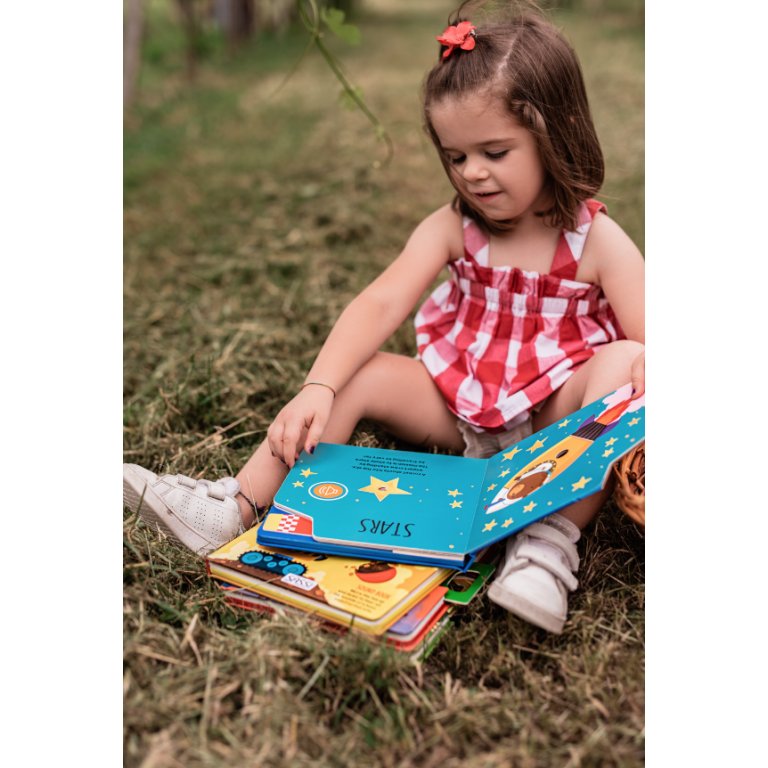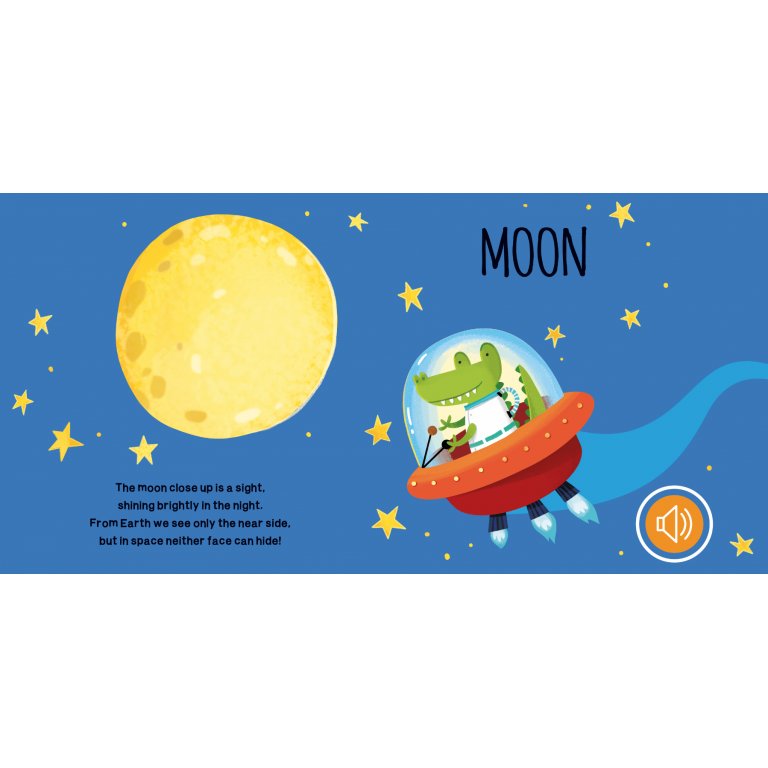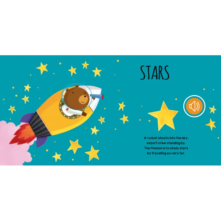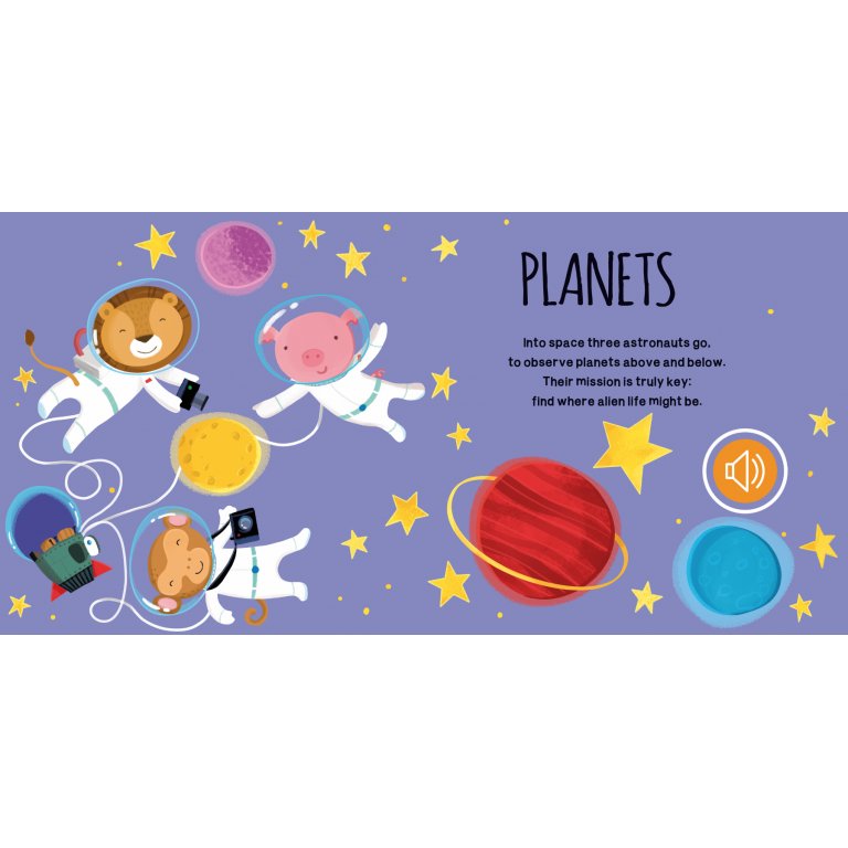 Read about the adventures of animals in space. Press the buttons to hear the sounds they make. Move the tab up and down to hear space radar while reading!