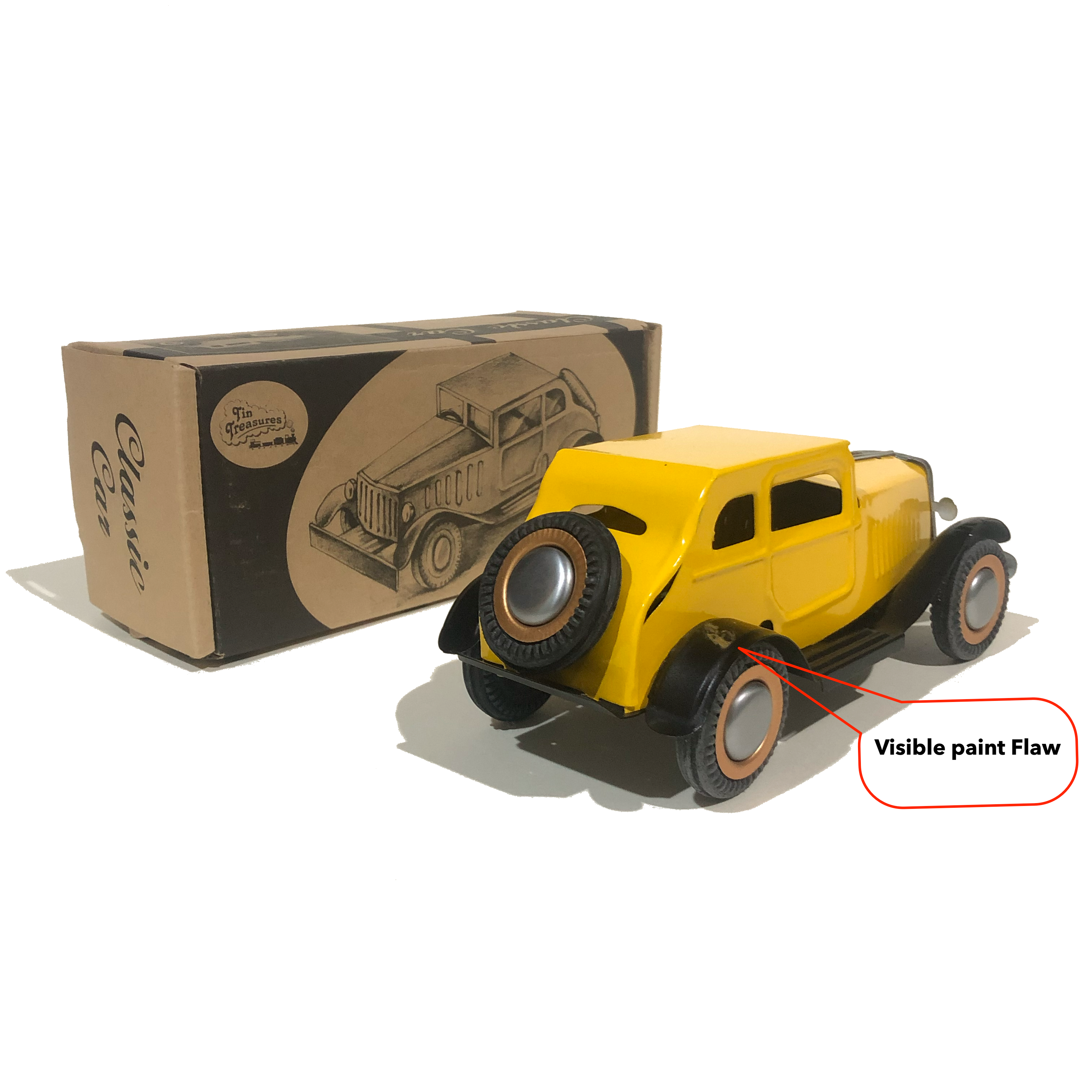 Every tin toy starts out as a flat sheet of metal that is printed and then cut into separate pieces. Each piece is then formed into its final shape through numerous tooling stations. The pieces are then hand-assembled to create the final toy. So, minor marks and paint flaws can occur.